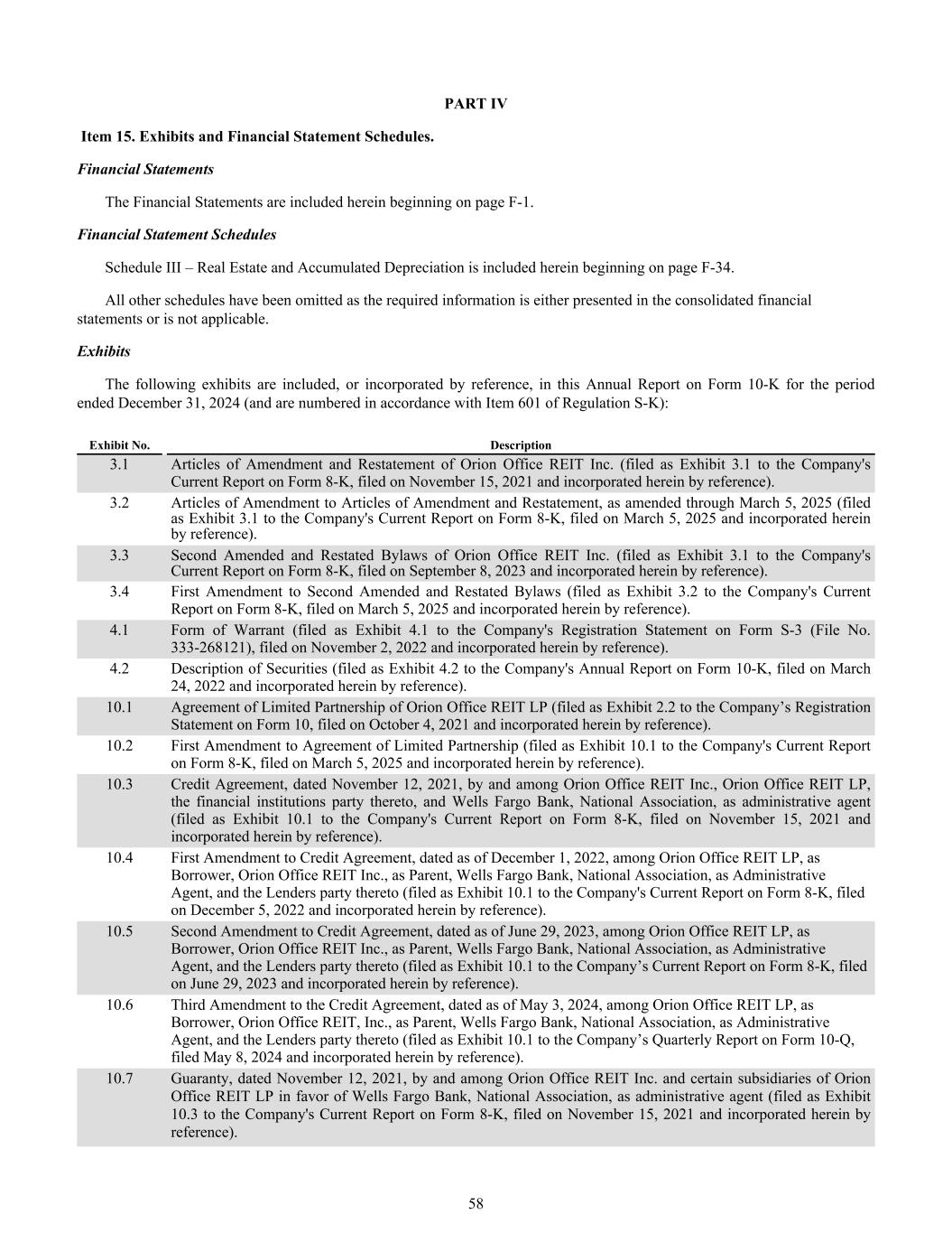 PART IV Item 15. Exhibits and Financial Statement Schedules. Financial Statements The Financial Statements are included herein beginning on page F-1. Financial Statement Schedules Schedule III – Real Estate and Accumulated Depreciation is included herein beginning on page F-34. All other schedules have been omitted as the required information is either presented in the consolidated financial statements or is not applicable. Exhibits The following exhibits are included, or incorporated by reference, in this Annual Report on Form 10-K for the period ended December 31, 2024 (and are numbered in accordance with Item 601 of Regulation S-K): Exhibit No. Description 3.1 Articles of Amendment and Restatement of Orion Office REIT Inc. (filed as Exhibit 3.1 to the Company's Current Report on Form 8-K, filed on November 15, 2021 and incorporated herein by reference). 3.2 Articles of Amendment to Articles of Amendment and Restatement, as amended through March 5, 2025 (filed as Exhibit 3.1 to the Company's Current Report on Form 8-K, filed on March 5, 2025 and incorporated herein by reference). 3.3 Second Amended and Restated Bylaws of Orion Office REIT Inc. (filed as Exhibit 3.1 to the Company's Current Report on Form 8-K, filed on September 8, 2023 and incorporated herein by reference). 3.4 First Amendment to Second Amended and Restated Bylaws (filed as Exhibit 3.2 to the Company's Current Report on Form 8-K, filed on March 5, 2025 and incorporated herein by reference). 4.1 Form of Warrant (filed as Exhibit 4.1 to the Company's Registration Statement on Form S-3 (File No. 333-268121), filed on November 2, 2022 and incorporated herein by reference). 4.2 Description of Securities (filed as Exhibit 4.2 to the Company's Annual Report on Form 10-K, filed on March 24, 2022 and incorporated herein by reference). 10.1 Agreement of Limited Partnership of Orion Office REIT LP (filed as Exhibit 2.2 to the Company’s Registration Statement on Form 10, filed on October 4, 2021 and incorporated herein by reference). 10.2 First Amendment to Agreement of Limited Partnership (filed as Exhibit 10.1 to the Company's Current Report on Form 8-K, filed on March 5, 2025 and incorporated herein by reference). 10.3 Credit Agreement, dated November 12, 2021, by and among Orion Office REIT Inc., Orion Office REIT LP, the financial institutions party thereto, and Wells Fargo Bank, National Association, as administrative agent (filed as Exhibit 10.1 to the Company's Current Report on Form 8-K, filed on November 15, 2021 and incorporated herein by reference). 10.4 First Amendment to Credit Agreement, dated as of December 1, 2022, among Orion Office REIT LP, as Borrower, Orion Office REIT Inc., as Parent, Wells Fargo Bank, National Association, as Administrative Agent, and the Lenders party thereto (filed as Exhibit 10.1 to the Company's Current Report on Form 8-K, filed on December 5, 2022 and incorporated herein by reference). 10.5 Second Amendment to Credit Agreement, dated as of June 29, 2023, among Orion Office REIT LP, as Borrower, Orion Office REIT Inc., as Parent, Wells Fargo Bank, National Association, as Administrative Agent, and the Lenders party thereto (filed as Exhibit 10.1 to the Company’s Current Report on Form 8-K, filed on June 29, 2023 and incorporated herein by reference). 10.6 Third Amendment to the Credit Agreement, dated as of May 3, 2024, among Orion Office REIT LP, as Borrower, Orion Office REIT, Inc., as Parent, Wells Fargo Bank, National Association, as Administrative Agent, and the Lenders party thereto (filed as Exhibit 10.1 to the Company’s Quarterly Report on Form 10-Q, filed May 8, 2024 and incorporated herein by reference). 10.7 Guaranty, dated November 12, 2021, by and among Orion Office REIT Inc. and certain subsidiaries of Orion Office REIT LP in favor of Wells Fargo Bank, National Association, as administrative agent (filed as Exhibit 10.3 to the Company's Current Report on Form 8-K, filed on November 15, 2021 and incorporated herein by reference). 58