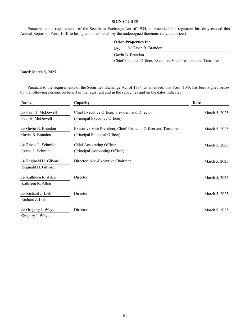 SIGNATURES Pursuant to the requirements of the Securities Exchange Act of 1934, as amended, the registrant has duly caused this Annual Report on Form 10-K to be signed on its behalf by the undersigned thereunto duly authorized. Orion Properties Inc. By: /s/ Gavin B. Brandon Gavin B. Brandon Chief Financial Officer, Executive Vice President and Treasurer Dated: March 5, 2025 Pursuant to the requirements of the Securities Exchange Act of 1934, as amended, this Form 10-K has been signed below by the following persons on behalf of the registrant and in the capacities and on the dates indicated. Name Capacity Date /s/ Paul H. McDowell Chief Executive Officer, President and Director March 5, 2025 Paul H. McDowell (Principal Executive Officer) /s/ Gavin B. Brandon Executive Vice President, Chief Financial Officer and Treasurer March 5, 2025 Gavin B. Brandon (Principal Financial Officer) /s/ Revea L. Schmidt Chief Accounting Officer March 5, 2025 Revea L. Schmidt (Principal Accounting Officer) /s/ Reginald H. Gilyard Director, Non-Executive Chairman March 5, 2025 Reginald H. Gilyard /s/ Kathleen R. Allen Director March 5, 2025 Kathleen R. Allen /s/ Richard J. Lieb Director March 5, 2025 Richard J. Lieb /s/ Gregory J. Whyte Director March 5, 2025 Gregory J. Whyte 61
