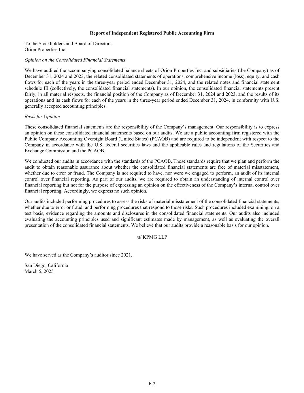 Report of Independent Registered Public Accounting Firm To the Stockholders and Board of Directors Orion Properties Inc.: Opinion on the Consolidated Financial Statements We have audited the accompanying consolidated balance sheets of Orion Properties Inc. and subsidiaries (the Company) as of December 31, 2024 and 2023, the related consolidated statements of operations, comprehensive income (loss), equity, and cash flows for each of the years in the three-year period ended December 31, 2024, and the related notes and financial statement schedule III (collectively, the consolidated financial statements). In our opinion, the consolidated financial statements present fairly, in all material respects, the financial position of the Company as of December 31, 2024 and 2023, and the results of its operations and its cash flows for each of the years in the three-year period ended December 31, 2024, in conformity with U.S. generally accepted accounting principles. Basis for Opinion These consolidated financial statements are the responsibility of the Company’s management. Our responsibility is to express an opinion on these consolidated financial statements based on our audits. We are a public accounting firm registered with the Public Company Accounting Oversight Board (United States) (PCAOB) and are required to be independent with respect to the Company in accordance with the U.S. federal securities laws and the applicable rules and regulations of the Securities and Exchange Commission and the PCAOB. We conducted our audits in accordance with the standards of the PCAOB. Those standards require that we plan and perform the audit to obtain reasonable assurance about whether the consolidated financial statements are free of material misstatement, whether due to error or fraud. The Company is not required to have, nor were we engaged to perform, an audit of its internal control over financial reporting. As part of our audits, we are required to obtain an understanding of internal control over financial reporting but not for the purpose of expressing an opinion on the effectiveness of the Company’s internal control over financial reporting. Accordingly, we express no such opinion. Our audits included performing procedures to assess the risks of material misstatement of the consolidated financial statements, whether due to error or fraud, and performing procedures that respond to those risks. Such procedures included examining, on a test basis, evidence regarding the amounts and disclosures in the consolidated financial statements. Our audits also included evaluating the accounting principles used and significant estimates made by management, as well as evaluating the overall presentation of the consolidated financial statements. We believe that our audits provide a reasonable basis for our opinion. /s/ KPMG LLP We have served as the Company’s auditor since 2021. San Diego, California March 5, 2025 F-2