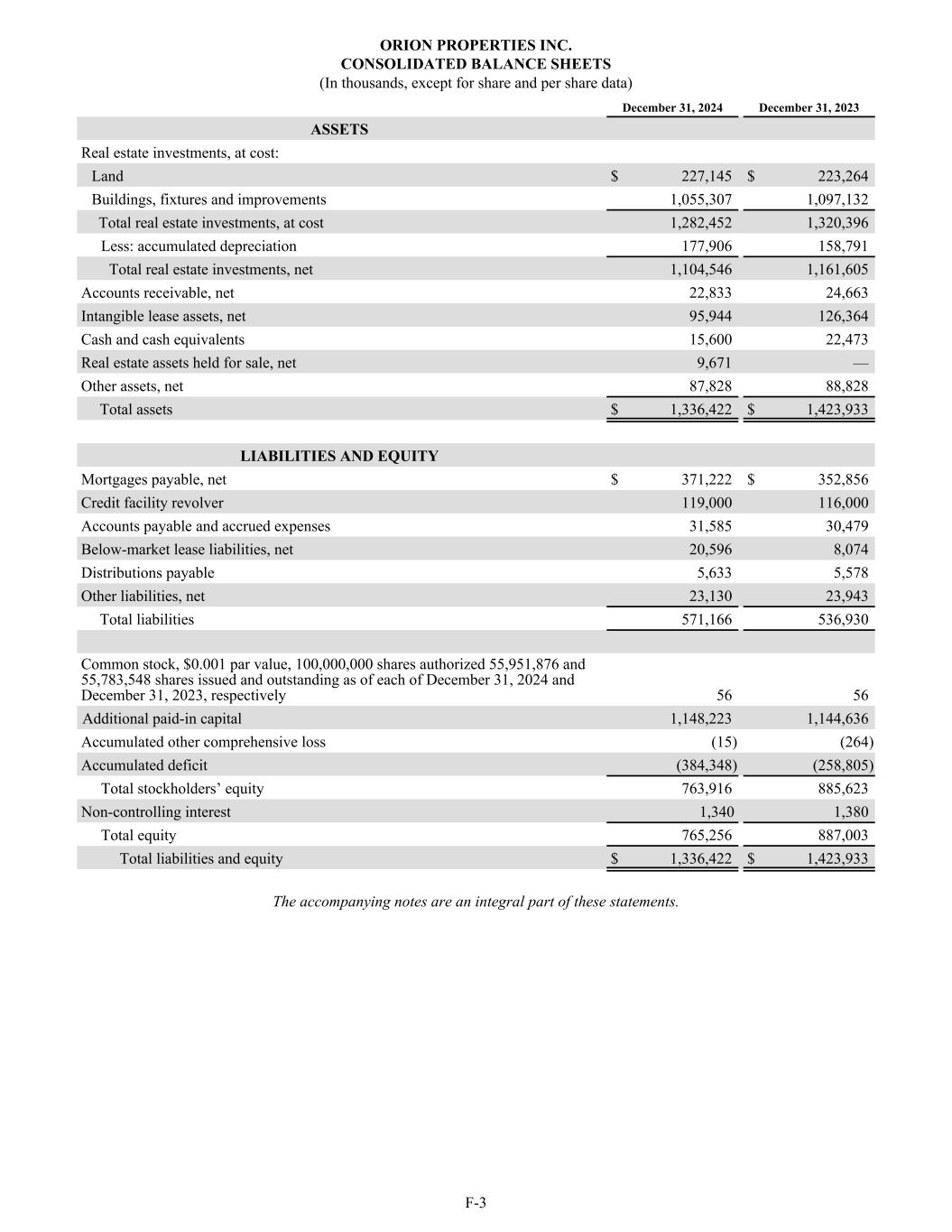December 31, 2024 December 31, 2023 ASSETS Real estate investments, at cost: Land $ 227,145 $ 223,264 Buildings, fixtures and improvements 1,055,307 1,097,132 Total real estate investments, at cost 1,282,452 1,320,396 Less: accumulated depreciation 177,906 158,791 Total real estate investments, net 1,104,546 1,161,605 Accounts receivable, net 22,833 24,663 Intangible lease assets, net 95,944 126,364 Cash and cash equivalents 15,600 22,473 Real estate assets held for sale, net 9,671 — Other assets, net 87,828 88,828 Total assets $ 1,336,422 $ 1,423,933 LIABILITIES AND EQUITY Mortgages payable, net $ 371,222 $ 352,856 Credit facility revolver 119,000 116,000 Accounts payable and accrued expenses 31,585 30,479 Below-market lease liabilities, net 20,596 8,074 Distributions payable 5,633 5,578 Other liabilities, net 23,130 23,943 Total liabilities 571,166 536,930 Common stock, $0.001 par value, 100,000,000 shares authorized 55,951,876 and 55,783,548 shares issued and outstanding as of each of December 31, 2024 and December 31, 2023, respectively 56 56 Additional paid-in capital 1,148,223 1,144,636 Accumulated other comprehensive loss (15) (264) Accumulated deficit (384,348) (258,805) Total stockholders’ equity 763,916 885,623 Non-controlling interest 1,340 1,380 Total equity 765,256 887,003 Total liabilities and equity $ 1,336,422 $ 1,423,933 The accompanying notes are an integral part of these statements. ORION PROPERTIES INC. CONSOLIDATED BALANCE SHEETS (In thousands, except for share and per share data) F-3