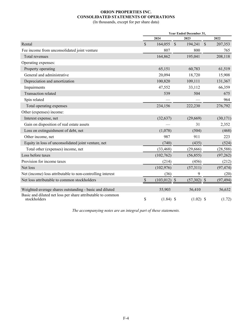 Year Ended December 31, 2024 2023 2022 Rental $ 164,055 $ 194,241 $ 207,353 Fee income from unconsolidated joint venture 807 800 765 Total revenues 164,862 195,041 208,118 Operating expenses: Property operating 65,151 60,783 61,519 General and administrative 20,094 18,720 15,908 Depreciation and amortization 100,820 109,111 131,367 Impairments 47,552 33,112 66,359 Transaction related 539 504 675 Spin related — — 964 Total operating expenses 234,156 222,230 276,792 Other (expenses) income: Interest expense, net (32,637) (29,669) (30,171) Gain on disposition of real estate assets — 31 2,352 Loss on extinguishment of debt, net (1,078) (504) (468) Other income, net 987 911 223 Equity in loss of unconsolidated joint venture, net (740) (435) (524) Total other (expenses) income, net (33,468) (29,666) (28,588) Loss before taxes (102,762) (56,855) (97,262) Provision for income taxes (214) (456) (212) Net loss (102,976) (57,311) (97,474) Net (income) loss attributable to non-controlling interest (36) 9 (20) Net loss attributable to common stockholders $ (103,012) $ (57,302) $ (97,494) Weighted-average shares outstanding - basic and diluted 55,903 56,410 56,632 Basic and diluted net loss per share attributable to common stockholders $ (1.84) $ (1.02) $ (1.72) The accompanying notes are an integral part of these statements. ORION PROPERTIES INC. CONSOLIDATED STATEMENTS OF OPERATIONS (In thousands, except for per share data) F-4