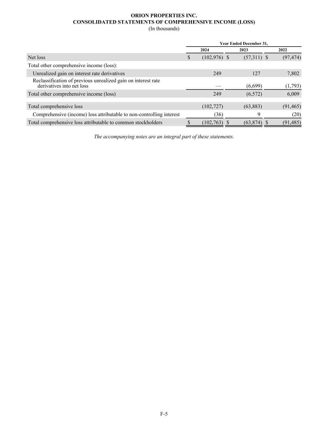 Year Ended December 31, 2024 2023 2022 Net loss $ (102,976) $ (57,311) $ (97,474) Total other comprehensive income (loss): Unrealized gain on interest rate derivatives 249 127 7,802 Reclassification of previous unrealized gain on interest rate derivatives into net loss — (6,699) (1,793) Total other comprehensive income (loss) 249 (6,572) 6,009 Total comprehensive loss (102,727) (63,883) (91,465) Comprehensive (income) loss attributable to non-controlling interest (36) 9 (20) Total comprehensive loss attributable to common stockholders $ (102,763) $ (63,874) $ (91,485) The accompanying notes are an integral part of these statements. ORION PROPERTIES INC. CONSOLIDATED STATEMENTS OF COMPREHENSIVE INCOME (LOSS) (In thousands) F-5
