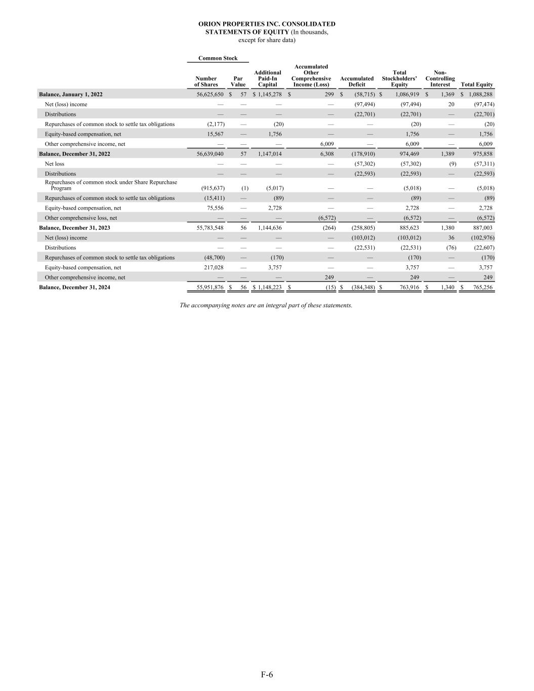 Balance, January 1, 2022 56,625,650 $ 57 $ 1,145,278 $ 299 $ (58,715) $ 1,086,919 $ 1,369 $ 1,088,288 Net (loss) income — — — — (97,494) (97,494) 20 (97,474) Distributions — — — — (22,701) (22,701) — (22,701) Repurchases of common stock to settle tax obligations (2,177) — (20) — — (20) — (20) Equity-based compensation, net 15,567 — 1,756 — — 1,756 — 1,756 Other comprehensive income, net — — — 6,009 — 6,009 — 6,009 Balance, December 31, 2022 56,639,040 57 1,147,014 6,308 (178,910) 974,469 1,389 975,858 Net loss — — — — (57,302) (57,302) (9) (57,311) Distributions — — — — (22,593) (22,593) — (22,593) Repurchases of common stock under Share Repurchase Program (915,637) (1) (5,017) — — (5,018) — (5,018) Repurchases of common stock to settle tax obligations (15,411) — (89) — — (89) — (89) Equity-based compensation, net 75,556 — 2,728 — — 2,728 — 2,728 Other comprehensive loss, net — — — (6,572) — (6,572) — (6,572) Balance, December 31, 2023 55,783,548 56 1,144,636 (264) (258,805) 885,623 1,380 887,003 Net (loss) income — — — — (103,012) (103,012) 36 (102,976) Distributions — — — — (22,531) (22,531) (76) (22,607) Repurchases of common stock to settle tax obligations (48,700) — (170) — — (170) — (170) Equity-based compensation, net 217,028 — 3,757 — — 3,757 — 3,757 Other comprehensive income, net — — — 249 — 249 — 249 Balance, December 31, 2024 55,951,876 $ 56 $ 1,148,223 $ (15) $ (384,348) $ 763,916 $ 1,340 $ 765,256 Number of Shares Par Value Additional Paid-In Capital Accumulated Other Comprehensive Income (Loss) Accumulated Deficit Total Stockholders’ Equity Non- Controlling Interest Total Equity The accompanying notes are an integral part of these statements. ORION PROPERTIES INC. CONSOLIDATED STATEMENTS OF EQUITY (In thousands, except for share data) Common Stock F-6