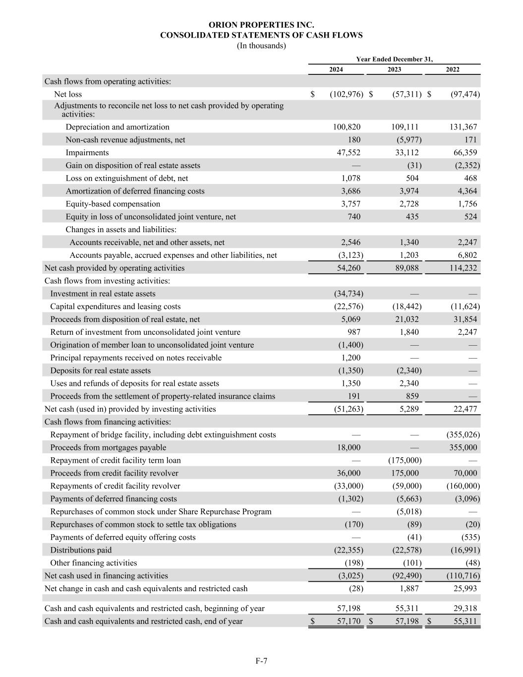 Year Ended December 31, 2024 2023 2022 Cash flows from operating activities: Net loss $ (102,976) $ (57,311) $ (97,474) Adjustments to reconcile net loss to net cash provided by operating activities: Depreciation and amortization 100,820 109,111 131,367 Non-cash revenue adjustments, net 180 (5,977) 171 Impairments 47,552 33,112 66,359 Gain on disposition of real estate assets — (31) (2,352) Loss on extinguishment of debt, net 1,078 504 468 Amortization of deferred financing costs 3,686 3,974 4,364 Equity-based compensation 3,757 2,728 1,756 Equity in loss of unconsolidated joint venture, net 740 435 524 Changes in assets and liabilities: Accounts receivable, net and other assets, net 2,546 1,340 2,247 Accounts payable, accrued expenses and other liabilities, net (3,123) 1,203 6,802 Net cash provided by operating activities 54,260 89,088 114,232 Cash flows from investing activities: Investment in real estate assets (34,734) — — Capital expenditures and leasing costs (22,576) (18,442) (11,624) Proceeds from disposition of real estate, net 5,069 21,032 31,854 Return of investment from unconsolidated joint venture 987 1,840 2,247 Origination of member loan to unconsolidated joint venture (1,400) — — Principal repayments received on notes receivable 1,200 — — Deposits for real estate assets (1,350) (2,340) — Uses and refunds of deposits for real estate assets 1,350 2,340 — Proceeds from the settlement of property-related insurance claims 191 859 — Net cash (used in) provided by investing activities (51,263) 5,289 22,477 Cash flows from financing activities: Repayment of bridge facility, including debt extinguishment costs — — (355,026) Proceeds from mortgages payable 18,000 — 355,000 Repayment of credit facility term loan — (175,000) — Proceeds from credit facility revolver 36,000 175,000 70,000 Repayments of credit facility revolver (33,000) (59,000) (160,000) Payments of deferred financing costs (1,302) (5,663) (3,096) Repurchases of common stock under Share Repurchase Program — (5,018) — Repurchases of common stock to settle tax obligations (170) (89) (20) Payments of deferred equity offering costs — (41) (535) Distributions paid (22,355) (22,578) (16,991) Other financing activities (198) (101) (48) Net cash used in financing activities (3,025) (92,490) (110,716) Net change in cash and cash equivalents and restricted cash (28) 1,887 25,993 Cash and cash equivalents and restricted cash, beginning of year 57,198 55,311 29,318 Cash and cash equivalents and restricted cash, end of year $ 57,170 $ 57,198 $ 55,311 ORION PROPERTIES INC. CONSOLIDATED STATEMENTS OF CASH FLOWS (In thousands) F-7