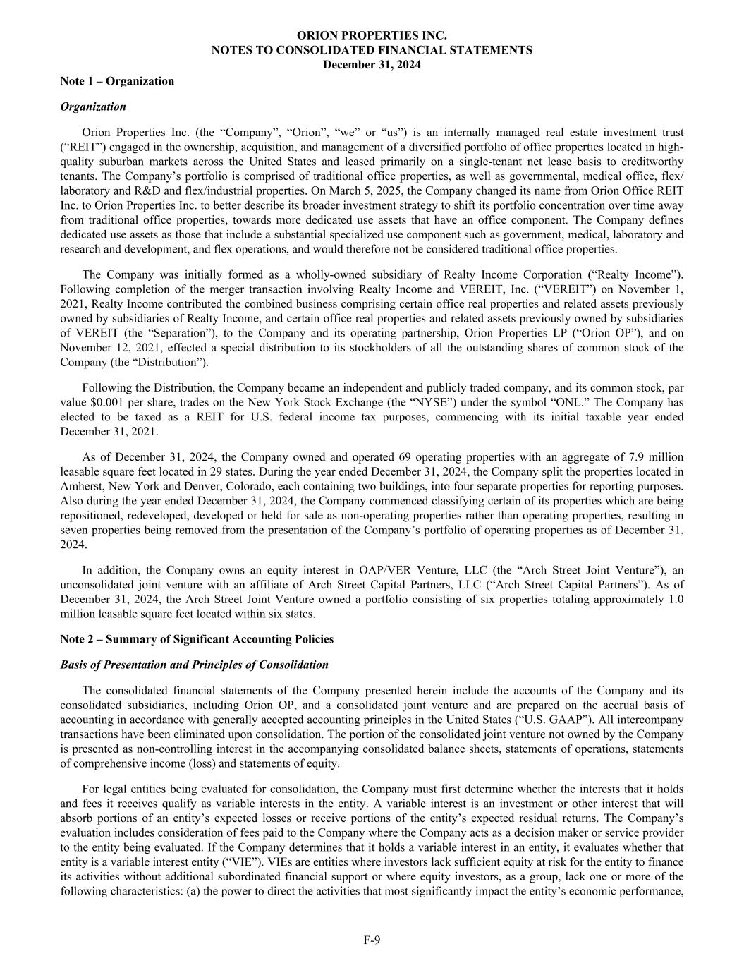 Note 1 – Organization Organization Orion Properties Inc. (the “Company”, “Orion”, “we” or “us”) is an internally managed real estate investment trust (“REIT”) engaged in the ownership, acquisition, and management of a diversified portfolio of office properties located in high- quality suburban markets across the United States and leased primarily on a single-tenant net lease basis to creditworthy tenants. The Company’s portfolio is comprised of traditional office properties, as well as governmental, medical office, flex/ laboratory and R&D and flex/industrial properties. On March 5, 2025, the Company changed its name from Orion Office REIT Inc. to Orion Properties Inc. to better describe its broader investment strategy to shift its portfolio concentration over time away from traditional office properties, towards more dedicated use assets that have an office component. The Company defines dedicated use assets as those that include a substantial specialized use component such as government, medical, laboratory and research and development, and flex operations, and would therefore not be considered traditional office properties. The Company was initially formed as a wholly-owned subsidiary of Realty Income Corporation (“Realty Income”). Following completion of the merger transaction involving Realty Income and VEREIT, Inc. (“VEREIT”) on November 1, 2021, Realty Income contributed the combined business comprising certain office real properties and related assets previously owned by subsidiaries of Realty Income, and certain office real properties and related assets previously owned by subsidiaries of VEREIT (the “Separation”), to the Company and its operating partnership, Orion Properties LP (“Orion OP”), and on November 12, 2021, effected a special distribution to its stockholders of all the outstanding shares of common stock of the Company (the “Distribution”). Following the Distribution, the Company became an independent and publicly traded company, and its common stock, par value $0.001 per share, trades on the New York Stock Exchange (the “NYSE”) under the symbol “ONL.” The Company has elected to be taxed as a REIT for U.S. federal income tax purposes, commencing with its initial taxable year ended December 31, 2021. As of December 31, 2024, the Company owned and operated 69 operating properties with an aggregate of 7.9 million leasable square feet located in 29 states. During the year ended December 31, 2024, the Company split the properties located in Amherst, New York and Denver, Colorado, each containing two buildings, into four separate properties for reporting purposes. Also during the year ended December 31, 2024, the Company commenced classifying certain of its properties which are being repositioned, redeveloped, developed or held for sale as non-operating properties rather than operating properties, resulting in seven properties being removed from the presentation of the Company’s portfolio of operating properties as of December 31, 2024. In addition, the Company owns an equity interest in OAP/VER Venture, LLC (the “Arch Street Joint Venture”), an unconsolidated joint venture with an affiliate of Arch Street Capital Partners, LLC (“Arch Street Capital Partners”). As of December 31, 2024, the Arch Street Joint Venture owned a portfolio consisting of six properties totaling approximately 1.0 million leasable square feet located within six states. Note 2 – Summary of Significant Accounting Policies Basis of Presentation and Principles of Consolidation The consolidated financial statements of the Company presented herein include the accounts of the Company and its consolidated subsidiaries, including Orion OP, and a consolidated joint venture and are prepared on the accrual basis of accounting in accordance with generally accepted accounting principles in the United States (“U.S. GAAP”). All intercompany transactions have been eliminated upon consolidation. The portion of the consolidated joint venture not owned by the Company is presented as non-controlling interest in the accompanying consolidated balance sheets, statements of operations, statements of comprehensive income (loss) and statements of equity. For legal entities being evaluated for consolidation, the Company must first determine whether the interests that it holds and fees it receives qualify as variable interests in the entity. A variable interest is an investment or other interest that will absorb portions of an entity’s expected losses or receive portions of the entity’s expected residual returns. The Company’s evaluation includes consideration of fees paid to the Company where the Company acts as a decision maker or service provider to the entity being evaluated. If the Company determines that it holds a variable interest in an entity, it evaluates whether that entity is a variable interest entity (“VIE”). VIEs are entities where investors lack sufficient equity at risk for the entity to finance its activities without additional subordinated financial support or where equity investors, as a group, lack one or more of the following characteristics: (a) the power to direct the activities that most significantly impact the entity’s economic performance, ORION PROPERTIES INC. NOTES TO CONSOLIDATED FINANCIAL STATEMENTS December 31, 2024 F-9