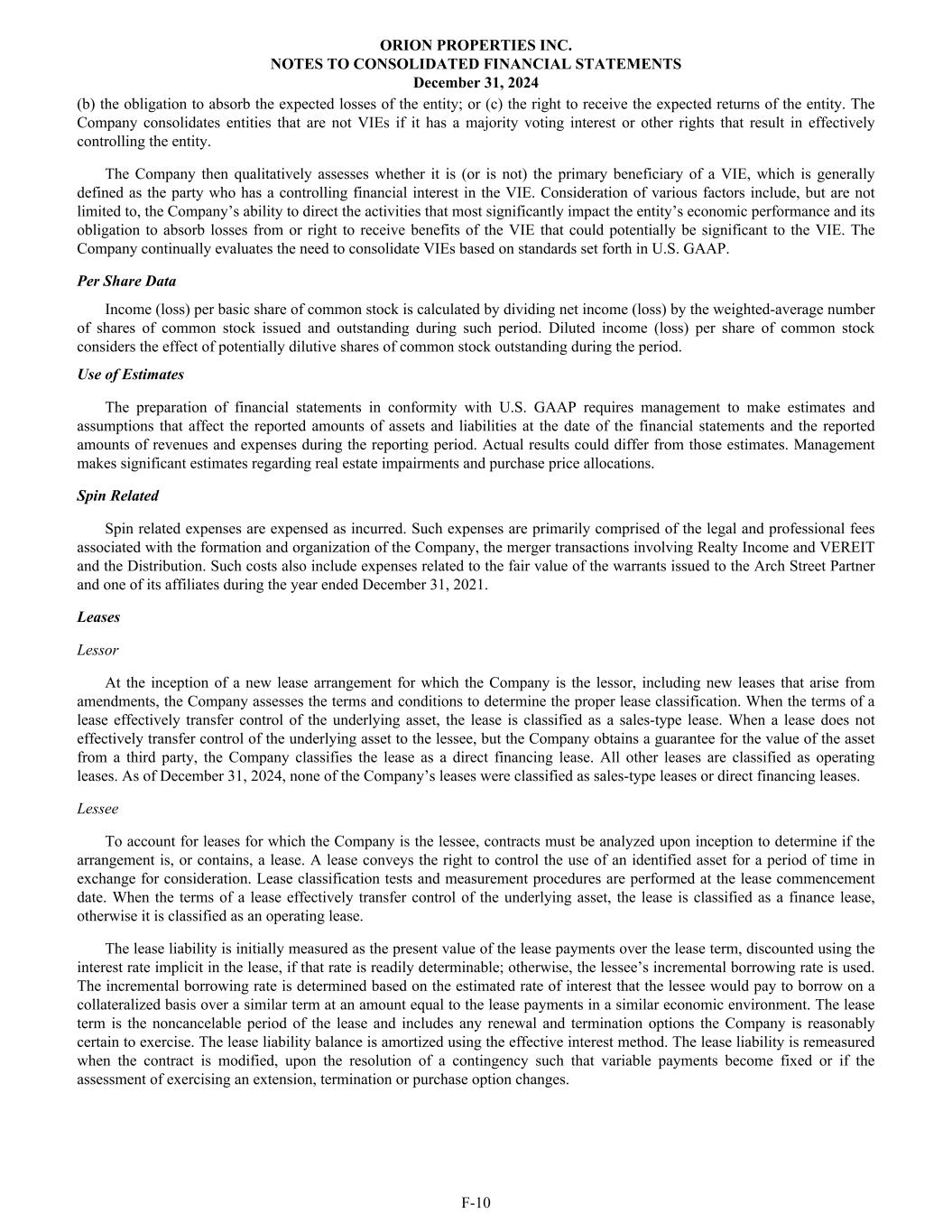 (b) the obligation to absorb the expected losses of the entity; or (c) the right to receive the expected returns of the entity. The Company consolidates entities that are not VIEs if it has a majority voting interest or other rights that result in effectively controlling the entity. The Company then qualitatively assesses whether it is (or is not) the primary beneficiary of a VIE, which is generally defined as the party who has a controlling financial interest in the VIE. Consideration of various factors include, but are not limited to, the Company’s ability to direct the activities that most significantly impact the entity’s economic performance and its obligation to absorb losses from or right to receive benefits of the VIE that could potentially be significant to the VIE. The Company continually evaluates the need to consolidate VIEs based on standards set forth in U.S. GAAP. Per Share Data Income (loss) per basic share of common stock is calculated by dividing net income (loss) by the weighted-average number of shares of common stock issued and outstanding during such period. Diluted income (loss) per share of common stock considers the effect of potentially dilutive shares of common stock outstanding during the period. Use of Estimates The preparation of financial statements in conformity with U.S. GAAP requires management to make estimates and assumptions that affect the reported amounts of assets and liabilities at the date of the financial statements and the reported amounts of revenues and expenses during the reporting period. Actual results could differ from those estimates. Management makes significant estimates regarding real estate impairments and purchase price allocations. Spin Related Spin related expenses are expensed as incurred. Such expenses are primarily comprised of the legal and professional fees associated with the formation and organization of the Company, the merger transactions involving Realty Income and VEREIT and the Distribution. Such costs also include expenses related to the fair value of the warrants issued to the Arch Street Partner and one of its affiliates during the year ended December 31, 2021. Leases Lessor At the inception of a new lease arrangement for which the Company is the lessor, including new leases that arise from amendments, the Company assesses the terms and conditions to determine the proper lease classification. When the terms of a lease effectively transfer control of the underlying asset, the lease is classified as a sales-type lease. When a lease does not effectively transfer control of the underlying asset to the lessee, but the Company obtains a guarantee for the value of the asset from a third party, the Company classifies the lease as a direct financing lease. All other leases are classified as operating leases. As of December 31, 2024, none of the Company’s leases were classified as sales-type leases or direct financing leases. Lessee To account for leases for which the Company is the lessee, contracts must be analyzed upon inception to determine if the arrangement is, or contains, a lease. A lease conveys the right to control the use of an identified asset for a period of time in exchange for consideration. Lease classification tests and measurement procedures are performed at the lease commencement date. When the terms of a lease effectively transfer control of the underlying asset, the lease is classified as a finance lease, otherwise it is classified as an operating lease. The lease liability is initially measured as the present value of the lease payments over the lease term, discounted using the interest rate implicit in the lease, if that rate is readily determinable; otherwise, the lessee’s incremental borrowing rate is used. The incremental borrowing rate is determined based on the estimated rate of interest that the lessee would pay to borrow on a collateralized basis over a similar term at an amount equal to the lease payments in a similar economic environment. The lease term is the noncancelable period of the lease and includes any renewal and termination options the Company is reasonably certain to exercise. The lease liability balance is amortized using the effective interest method. The lease liability is remeasured when the contract is modified, upon the resolution of a contingency such that variable payments become fixed or if the assessment of exercising an extension, termination or purchase option changes. ORION PROPERTIES INC. NOTES TO CONSOLIDATED FINANCIAL STATEMENTS December 31, 2024 F-10