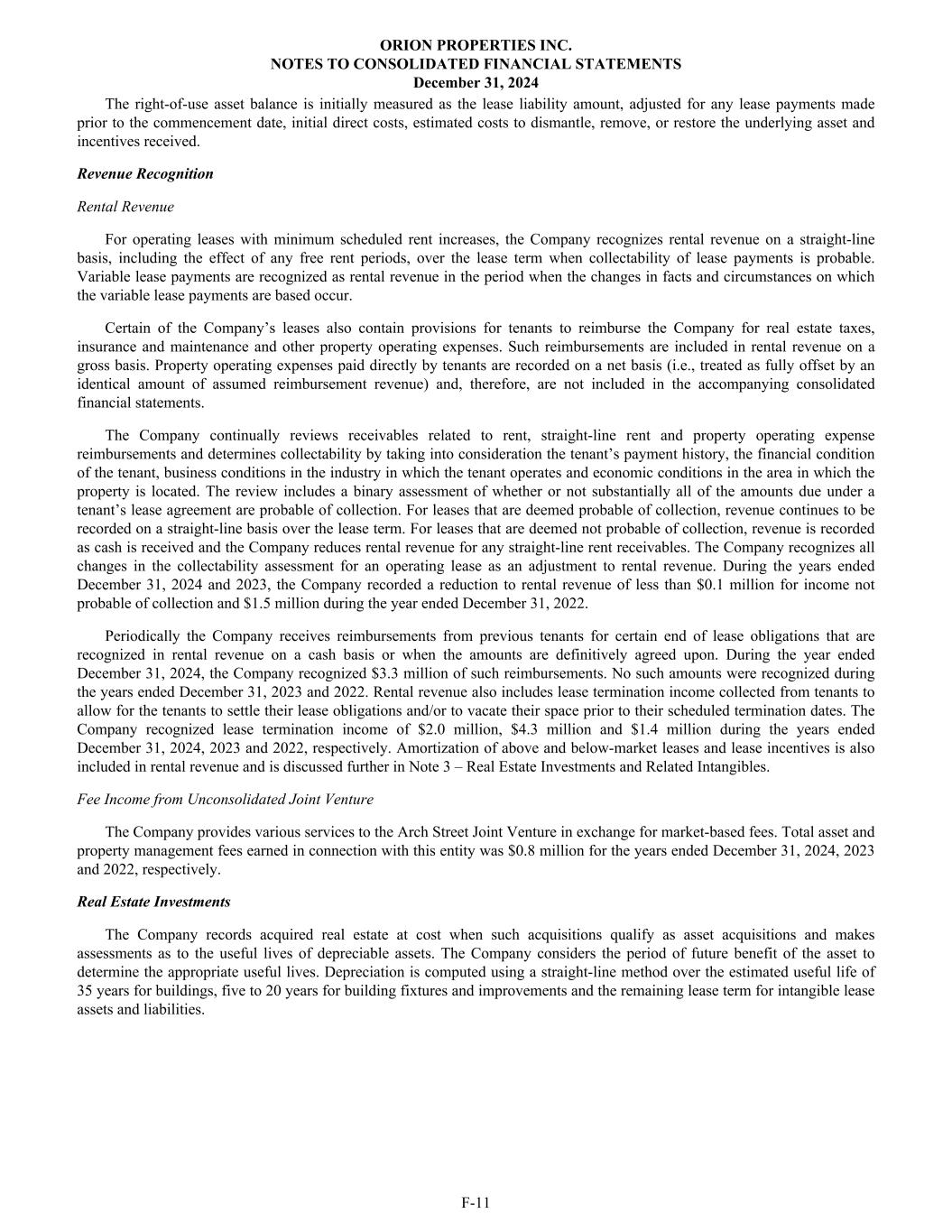The right-of-use asset balance is initially measured as the lease liability amount, adjusted for any lease payments made prior to the commencement date, initial direct costs, estimated costs to dismantle, remove, or restore the underlying asset and incentives received. Revenue Recognition Rental Revenue For operating leases with minimum scheduled rent increases, the Company recognizes rental revenue on a straight-line basis, including the effect of any free rent periods, over the lease term when collectability of lease payments is probable. Variable lease payments are recognized as rental revenue in the period when the changes in facts and circumstances on which the variable lease payments are based occur. Certain of the Company’s leases also contain provisions for tenants to reimburse the Company for real estate taxes, insurance and maintenance and other property operating expenses. Such reimbursements are included in rental revenue on a gross basis. Property operating expenses paid directly by tenants are recorded on a net basis (i.e., treated as fully offset by an identical amount of assumed reimbursement revenue) and, therefore, are not included in the accompanying consolidated financial statements. The Company continually reviews receivables related to rent, straight-line rent and property operating expense reimbursements and determines collectability by taking into consideration the tenant’s payment history, the financial condition of the tenant, business conditions in the industry in which the tenant operates and economic conditions in the area in which the property is located. The review includes a binary assessment of whether or not substantially all of the amounts due under a tenant’s lease agreement are probable of collection. For leases that are deemed probable of collection, revenue continues to be recorded on a straight-line basis over the lease term. For leases that are deemed not probable of collection, revenue is recorded as cash is received and the Company reduces rental revenue for any straight-line rent receivables. The Company recognizes all changes in the collectability assessment for an operating lease as an adjustment to rental revenue. During the years ended December 31, 2024 and 2023, the Company recorded a reduction to rental revenue of less than $0.1 million for income not probable of collection and $1.5 million during the year ended December 31, 2022. Periodically the Company receives reimbursements from previous tenants for certain end of lease obligations that are recognized in rental revenue on a cash basis or when the amounts are definitively agreed upon. During the year ended December 31, 2024, the Company recognized $3.3 million of such reimbursements. No such amounts were recognized during the years ended December 31, 2023 and 2022. Rental revenue also includes lease termination income collected from tenants to allow for the tenants to settle their lease obligations and/or to vacate their space prior to their scheduled termination dates. The Company recognized lease termination income of $2.0 million, $4.3 million and $1.4 million during the years ended December 31, 2024, 2023 and 2022, respectively. Amortization of above and below-market leases and lease incentives is also included in rental revenue and is discussed further in Note 3 – Real Estate Investments and Related Intangibles. Fee Income from Unconsolidated Joint Venture The Company provides various services to the Arch Street Joint Venture in exchange for market-based fees. Total asset and property management fees earned in connection with this entity was $0.8 million for the years ended December 31, 2024, 2023 and 2022, respectively. Real Estate Investments The Company records acquired real estate at cost when such acquisitions qualify as asset acquisitions and makes assessments as to the useful lives of depreciable assets. The Company considers the period of future benefit of the asset to determine the appropriate useful lives. Depreciation is computed using a straight-line method over the estimated useful life of 35 years for buildings, five to 20 years for building fixtures and improvements and the remaining lease term for intangible lease assets and liabilities. ORION PROPERTIES INC. NOTES TO CONSOLIDATED FINANCIAL STATEMENTS December 31, 2024 F-11