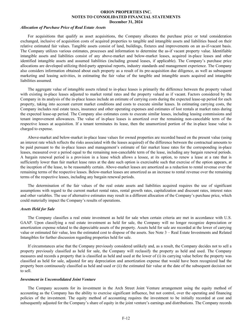 Allocation of Purchase Price of Real Estate Assets For acquisitions that qualify as asset acquisitions, the Company allocates the purchase price or total consideration exchanged, inclusive of acquisition costs of acquired properties to tangible and intangible assets and liabilities based on their relative estimated fair values. Tangible assets consist of land, buildings, fixtures and improvements on an as-if-vacant basis. The Company utilizes various estimates, processes and information to determine the as-if vacant property value. Identifiable intangible assets and liabilities consist of any above-market and below-market leases, acquired in-place leases and other identified intangible assets and assumed liabilities (including ground leases, if applicable). The Company’s purchase price allocations are developed utilizing third-party appraisal reports, industry standards and management experience. The Company also considers information obtained about each property as a result of its pre-acquisition due diligence, as well as subsequent marketing and leasing activities, in estimating the fair value of the tangible and intangible assets acquired and intangible liabilities assumed. The aggregate value of intangible assets related to in-place leases is primarily the difference between the property valued with existing in-place leases adjusted to market rental rates and the property valued as if vacant. Factors considered by the Company in its analysis of the in-place leases include an estimate of carrying costs during the expected lease-up period for each property, taking into account current market conditions and costs to execute similar leases. In estimating carrying costs, the Company includes real estate taxes, insurance and other operating expenses and estimates of lost rentals at market rates during the expected lease-up period. The Company also estimates costs to execute similar leases, including leasing commissions and tenant improvement allowances. The value of in-place leases is amortized over the remaining non-cancelable term of the respective leases at acquisition. If a tenant terminates its lease, then the unamortized portion of the in-place lease value is charged to expense. Above-market and below-market in-place lease values for owned properties are recorded based on the present value (using an interest rate which reflects the risks associated with the leases acquired) of the difference between the contractual amounts to be paid pursuant to the in-place leases and management’s estimate of fair market lease rates for the corresponding in-place leases, measured over a period equal to the remaining non-cancelable term of the lease, including any bargain renewal periods. A bargain renewal period is a provision in a lease which allows a lessee, at its option, to renew a lease at a rate that is sufficiently lower than fair market lease rates at the date such option is exercisable such that exercise of the option appears, at the inception of the lease, to be reasonably certain. Above-market leases are amortized as a reduction to rental revenue over the remaining terms of the respective leases. Below-market leases are amortized as an increase to rental revenue over the remaining terms of the respective leases, including any bargain renewal periods. The determination of the fair values of the real estate assets and liabilities acquired requires the use of significant assumptions with regard to the current market rental rates, rental growth rates, capitalization and discount rates, interest rates and other variables. The use of alternative estimates may result in a different allocation of the Company’s purchase price, which could materially impact the Company’s results of operations. Assets Held for Sale The Company classifies a real estate investment as held for sale when certain criteria are met in accordance with U.S. GAAP. Upon classifying a real estate investment as held for sale, the Company will no longer recognize depreciation or amortization expense related to the depreciable assets of the property. Assets held for sale are recorded at the lower of carrying value or estimated fair value, less the estimated cost to dispose of the assets. See Note 3 – Real Estate Investments and Related Intangibles for further discussion regarding properties held for sale. If circumstances arise that the Company previously considered unlikely and, as a result, the Company decides not to sell a property previously classified as held for sale, the Company will reclassify the property as held and used. The Company measures and records a property that is classified as held and used at the lower of (i) its carrying value before the property was classified as held for sale, adjusted for any depreciation and amortization expense that would have been recognized had the property been continuously classified as held and used or (ii) the estimated fair value at the date of the subsequent decision not to sell. Investment in Unconsolidated Joint Venture The Company accounts for its investment in the Arch Street Joint Venture arrangement using the equity method of accounting as the Company has the ability to exercise significant influence, but not control, over the operating and financing policies of the investment. The equity method of accounting requires the investment to be initially recorded at cost and subsequently adjusted for the Company’s share of equity in the joint venture’s earnings and distributions. The Company records ORION PROPERTIES INC. NOTES TO CONSOLIDATED FINANCIAL STATEMENTS December 31, 2024 F-12