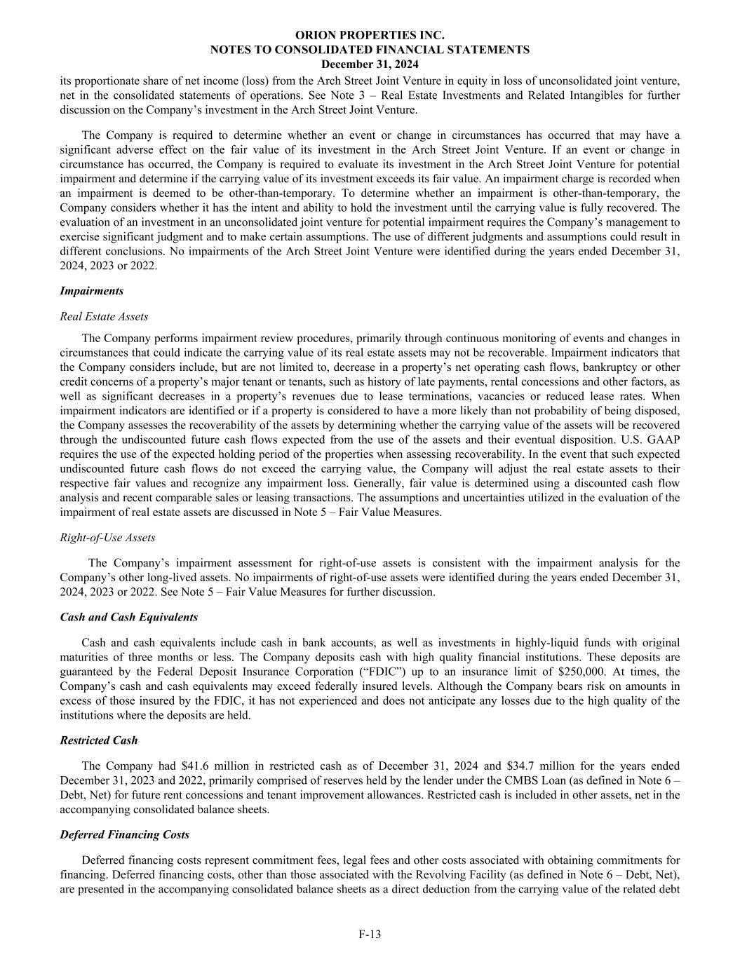 its proportionate share of net income (loss) from the Arch Street Joint Venture in equity in loss of unconsolidated joint venture, net in the consolidated statements of operations. See Note 3 – Real Estate Investments and Related Intangibles for further discussion on the Company’s investment in the Arch Street Joint Venture. The Company is required to determine whether an event or change in circumstances has occurred that may have a significant adverse effect on the fair value of its investment in the Arch Street Joint Venture. If an event or change in circumstance has occurred, the Company is required to evaluate its investment in the Arch Street Joint Venture for potential impairment and determine if the carrying value of its investment exceeds its fair value. An impairment charge is recorded when an impairment is deemed to be other-than-temporary. To determine whether an impairment is other-than-temporary, the Company considers whether it has the intent and ability to hold the investment until the carrying value is fully recovered. The evaluation of an investment in an unconsolidated joint venture for potential impairment requires the Company’s management to exercise significant judgment and to make certain assumptions. The use of different judgments and assumptions could result in different conclusions. No impairments of the Arch Street Joint Venture were identified during the years ended December 31, 2024, 2023 or 2022. Impairments Real Estate Assets The Company performs impairment review procedures, primarily through continuous monitoring of events and changes in circumstances that could indicate the carrying value of its real estate assets may not be recoverable. Impairment indicators that the Company considers include, but are not limited to, decrease in a property’s net operating cash flows, bankruptcy or other credit concerns of a property’s major tenant or tenants, such as history of late payments, rental concessions and other factors, as well as significant decreases in a property’s revenues due to lease terminations, vacancies or reduced lease rates. When impairment indicators are identified or if a property is considered to have a more likely than not probability of being disposed, the Company assesses the recoverability of the assets by determining whether the carrying value of the assets will be recovered through the undiscounted future cash flows expected from the use of the assets and their eventual disposition. U.S. GAAP requires the use of the expected holding period of the properties when assessing recoverability. In the event that such expected undiscounted future cash flows do not exceed the carrying value, the Company will adjust the real estate assets to their respective fair values and recognize any impairment loss. Generally, fair value is determined using a discounted cash flow analysis and recent comparable sales or leasing transactions. The assumptions and uncertainties utilized in the evaluation of the impairment of real estate assets are discussed in Note 5 – Fair Value Measures. Right-of-Use Assets The Company’s impairment assessment for right-of-use assets is consistent with the impairment analysis for the Company’s other long-lived assets. No impairments of right-of-use assets were identified during the years ended December 31, 2024, 2023 or 2022. See Note 5 – Fair Value Measures for further discussion. Cash and Cash Equivalents Cash and cash equivalents include cash in bank accounts, as well as investments in highly-liquid funds with original maturities of three months or less. The Company deposits cash with high quality financial institutions. These deposits are guaranteed by the Federal Deposit Insurance Corporation (“FDIC”) up to an insurance limit of $250,000. At times, the Company’s cash and cash equivalents may exceed federally insured levels. Although the Company bears risk on amounts in excess of those insured by the FDIC, it has not experienced and does not anticipate any losses due to the high quality of the institutions where the deposits are held. Restricted Cash The Company had $41.6 million in restricted cash as of December 31, 2024 and $34.7 million for the years ended December 31, 2023 and 2022, primarily comprised of reserves held by the lender under the CMBS Loan (as defined in Note 6 – Debt, Net) for future rent concessions and tenant improvement allowances. Restricted cash is included in other assets, net in the accompanying consolidated balance sheets. Deferred Financing Costs Deferred financing costs represent commitment fees, legal fees and other costs associated with obtaining commitments for financing. Deferred financing costs, other than those associated with the Revolving Facility (as defined in Note 6 – Debt, Net), are presented in the accompanying consolidated balance sheets as a direct deduction from the carrying value of the related debt ORION PROPERTIES INC. NOTES TO CONSOLIDATED FINANCIAL STATEMENTS December 31, 2024 F-13
