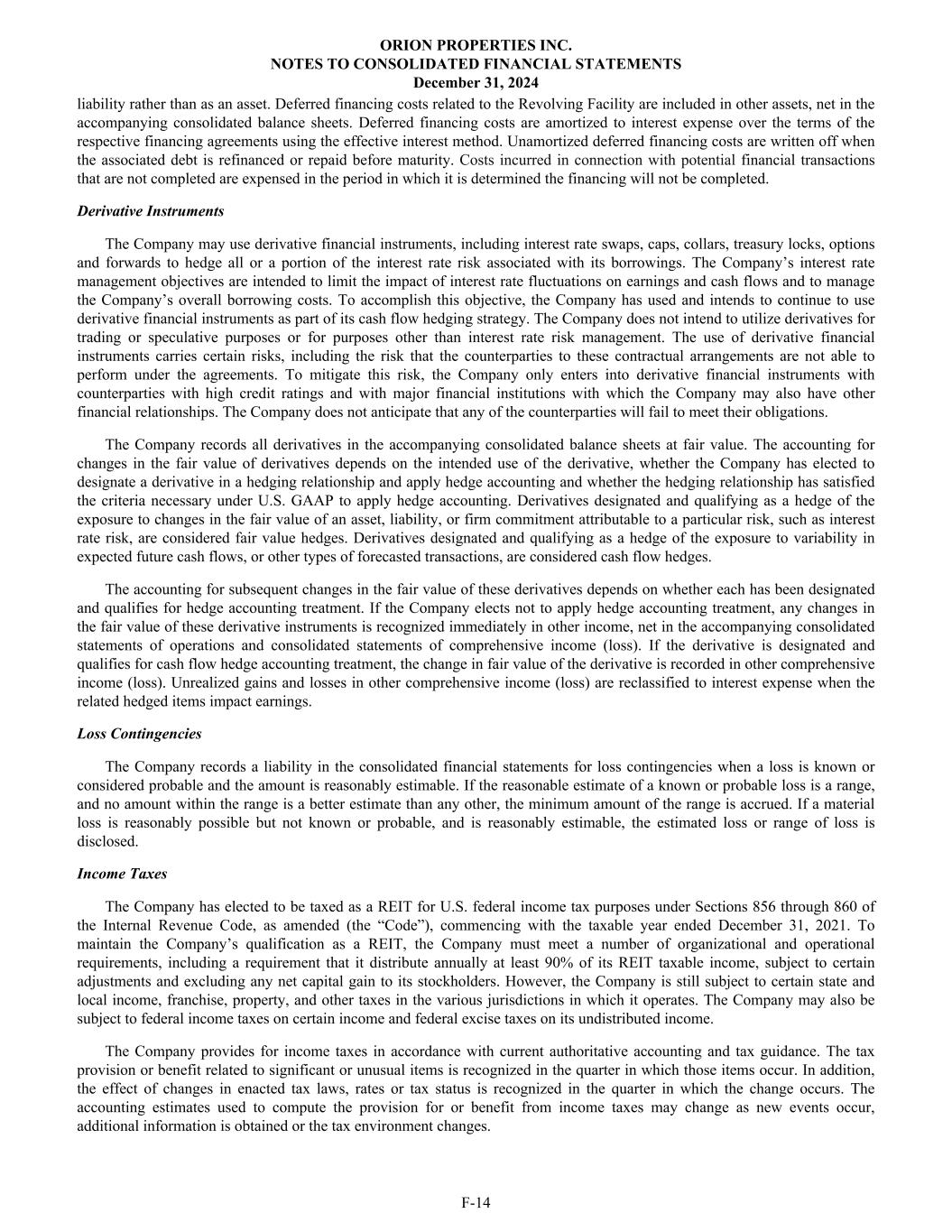 liability rather than as an asset. Deferred financing costs related to the Revolving Facility are included in other assets, net in the accompanying consolidated balance sheets. Deferred financing costs are amortized to interest expense over the terms of the respective financing agreements using the effective interest method. Unamortized deferred financing costs are written off when the associated debt is refinanced or repaid before maturity. Costs incurred in connection with potential financial transactions that are not completed are expensed in the period in which it is determined the financing will not be completed. Derivative Instruments The Company may use derivative financial instruments, including interest rate swaps, caps, collars, treasury locks, options and forwards to hedge all or a portion of the interest rate risk associated with its borrowings. The Company’s interest rate management objectives are intended to limit the impact of interest rate fluctuations on earnings and cash flows and to manage the Company’s overall borrowing costs. To accomplish this objective, the Company has used and intends to continue to use derivative financial instruments as part of its cash flow hedging strategy. The Company does not intend to utilize derivatives for trading or speculative purposes or for purposes other than interest rate risk management. The use of derivative financial instruments carries certain risks, including the risk that the counterparties to these contractual arrangements are not able to perform under the agreements. To mitigate this risk, the Company only enters into derivative financial instruments with counterparties with high credit ratings and with major financial institutions with which the Company may also have other financial relationships. The Company does not anticipate that any of the counterparties will fail to meet their obligations. The Company records all derivatives in the accompanying consolidated balance sheets at fair value. The accounting for changes in the fair value of derivatives depends on the intended use of the derivative, whether the Company has elected to designate a derivative in a hedging relationship and apply hedge accounting and whether the hedging relationship has satisfied the criteria necessary under U.S. GAAP to apply hedge accounting. Derivatives designated and qualifying as a hedge of the exposure to changes in the fair value of an asset, liability, or firm commitment attributable to a particular risk, such as interest rate risk, are considered fair value hedges. Derivatives designated and qualifying as a hedge of the exposure to variability in expected future cash flows, or other types of forecasted transactions, are considered cash flow hedges. The accounting for subsequent changes in the fair value of these derivatives depends on whether each has been designated and qualifies for hedge accounting treatment. If the Company elects not to apply hedge accounting treatment, any changes in the fair value of these derivative instruments is recognized immediately in other income, net in the accompanying consolidated statements of operations and consolidated statements of comprehensive income (loss). If the derivative is designated and qualifies for cash flow hedge accounting treatment, the change in fair value of the derivative is recorded in other comprehensive income (loss). Unrealized gains and losses in other comprehensive income (loss) are reclassified to interest expense when the related hedged items impact earnings. Loss Contingencies The Company records a liability in the consolidated financial statements for loss contingencies when a loss is known or considered probable and the amount is reasonably estimable. If the reasonable estimate of a known or probable loss is a range, and no amount within the range is a better estimate than any other, the minimum amount of the range is accrued. If a material loss is reasonably possible but not known or probable, and is reasonably estimable, the estimated loss or range of loss is disclosed. Income Taxes The Company has elected to be taxed as a REIT for U.S. federal income tax purposes under Sections 856 through 860 of the Internal Revenue Code, as amended (the “Code”), commencing with the taxable year ended December 31, 2021. To maintain the Company’s qualification as a REIT, the Company must meet a number of organizational and operational requirements, including a requirement that it distribute annually at least 90% of its REIT taxable income, subject to certain adjustments and excluding any net capital gain to its stockholders. However, the Company is still subject to certain state and local income, franchise, property, and other taxes in the various jurisdictions in which it operates. The Company may also be subject to federal income taxes on certain income and federal excise taxes on its undistributed income. The Company provides for income taxes in accordance with current authoritative accounting and tax guidance. The tax provision or benefit related to significant or unusual items is recognized in the quarter in which those items occur. In addition, the effect of changes in enacted tax laws, rates or tax status is recognized in the quarter in which the change occurs. The accounting estimates used to compute the provision for or benefit from income taxes may change as new events occur, additional information is obtained or the tax environment changes. ORION PROPERTIES INC. NOTES TO CONSOLIDATED FINANCIAL STATEMENTS December 31, 2024 F-14