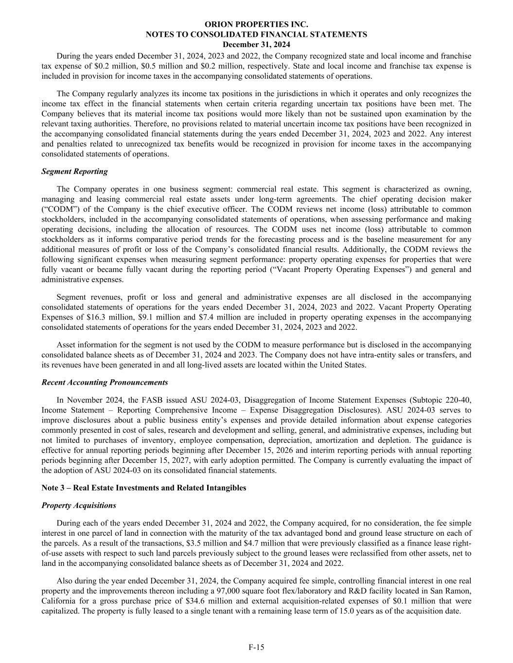 During the years ended December 31, 2024, 2023 and 2022, the Company recognized state and local income and franchise tax expense of $0.2 million, $0.5 million and $0.2 million, respectively. State and local income and franchise tax expense is included in provision for income taxes in the accompanying consolidated statements of operations. The Company regularly analyzes its income tax positions in the jurisdictions in which it operates and only recognizes the income tax effect in the financial statements when certain criteria regarding uncertain tax positions have been met. The Company believes that its material income tax positions would more likely than not be sustained upon examination by the relevant taxing authorities. Therefore, no provisions related to material uncertain income tax positions have been recognized in the accompanying consolidated financial statements during the years ended December 31, 2024, 2023 and 2022. Any interest and penalties related to unrecognized tax benefits would be recognized in provision for income taxes in the accompanying consolidated statements of operations. Segment Reporting The Company operates in one business segment: commercial real estate. This segment is characterized as owning, managing and leasing commercial real estate assets under long-term agreements. The chief operating decision maker (“CODM”) of the Company is the chief executive officer. The CODM reviews net income (loss) attributable to common stockholders, included in the accompanying consolidated statements of operations, when assessing performance and making operating decisions, including the allocation of resources. The CODM uses net income (loss) attributable to common stockholders as it informs comparative period trends for the forecasting process and is the baseline measurement for any additional measures of profit or loss of the Company’s consolidated financial results. Additionally, the CODM reviews the following significant expenses when measuring segment performance: property operating expenses for properties that were fully vacant or became fully vacant during the reporting period (“Vacant Property Operating Expenses”) and general and administrative expenses. Segment revenues, profit or loss and general and administrative expenses are all disclosed in the accompanying consolidated statements of operations for the years ended December 31, 2024, 2023 and 2022. Vacant Property Operating Expenses of $16.3 million, $9.1 million and $7.4 million are included in property operating expenses in the accompanying consolidated statements of operations for the years ended December 31, 2024, 2023 and 2022. Asset information for the segment is not used by the CODM to measure performance but is disclosed in the accompanying consolidated balance sheets as of December 31, 2024 and 2023. The Company does not have intra-entity sales or transfers, and its revenues have been generated in and all long-lived assets are located within the United States. Recent Accounting Pronouncements In November 2024, the FASB issued ASU 2024-03, Disaggregation of Income Statement Expenses (Subtopic 220-40, Income Statement – Reporting Comprehensive Income – Expense Disaggregation Disclosures). ASU 2024-03 serves to improve disclosures about a public business entity’s expenses and provide detailed information about expense categories commonly presented in cost of sales, research and development and selling, general, and administrative expenses, including but not limited to purchases of inventory, employee compensation, depreciation, amortization and depletion. The guidance is effective for annual reporting periods beginning after December 15, 2026 and interim reporting periods with annual reporting periods beginning after December 15, 2027, with early adoption permitted. The Company is currently evaluating the impact of the adoption of ASU 2024-03 on its consolidated financial statements. Note 3 – Real Estate Investments and Related Intangibles Property Acquisitions During each of the years ended December 31, 2024 and 2022, the Company acquired, for no consideration, the fee simple interest in one parcel of land in connection with the maturity of the tax advantaged bond and ground lease structure on each of the parcels. As a result of the transactions, $3.5 million and $4.7 million that were previously classified as a finance lease right- of-use assets with respect to such land parcels previously subject to the ground leases were reclassified from other assets, net to land in the accompanying consolidated balance sheets as of December 31, 2024 and 2022. Also during the year ended December 31, 2024, the Company acquired fee simple, controlling financial interest in one real property and the improvements thereon including a 97,000 square foot flex/laboratory and R&D facility located in San Ramon, California for a gross purchase price of $34.6 million and external acquisition-related expenses of $0.1 million that were capitalized. The property is fully leased to a single tenant with a remaining lease term of 15.0 years as of the acquisition date. ORION PROPERTIES INC. NOTES TO CONSOLIDATED FINANCIAL STATEMENTS December 31, 2024 F-15