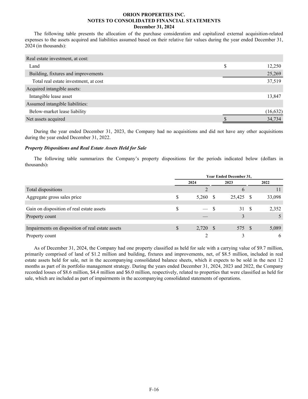 The following table presents the allocation of the purchase consideration and capitalized external acquisition-related expenses to the assets acquired and liabilities assumed based on their relative fair values during the year ended December 31, 2024 (in thousands): Real estate investment, at cost: Land $ 12,250 Building, fixtures and improvements 25,269 Total real estate investment, at cost 37,519 Acquired intangible assets: Intangible lease asset 13,847 Assumed intangible liabilities: Below-market lease liability (16,632) Net assets acquired $ 34,734 During the year ended December 31, 2023, the Company had no acquisitions and did not have any other acquisitions during the year ended December 31, 2022. Property Dispositions and Real Estate Assets Held for Sale The following table summarizes the Company’s property dispositions for the periods indicated below (dollars in thousands): Year Ended December 31, 2024 2023 2022 Total dispositions 2 6 11 Aggregate gross sales price $ 5,260 $ 25,425 $ 33,098 Gain on disposition of real estate assets $ — $ 31 $ 2,352 Property count — 3 5 Impairments on disposition of real estate assets $ 2,720 $ 575 $ 5,089 Property count 2 3 6 As of December 31, 2024, the Company had one property classified as held for sale with a carrying value of $9.7 million, primarily comprised of land of $1.2 million and building, fixtures and improvements, net, of $8.5 million, included in real estate assets held for sale, net in the accompanying consolidated balance sheets, which it expects to be sold in the next 12 months as part of its portfolio management strategy. During the years ended December 31, 2024, 2023 and 2022, the Company recorded losses of $8.6 million, $4.4 million and $6.0 million, respectively, related to properties that were classified as held for sale, which are included as part of impairments in the accompanying consolidated statements of operations. ORION PROPERTIES INC. NOTES TO CONSOLIDATED FINANCIAL STATEMENTS December 31, 2024 F-16