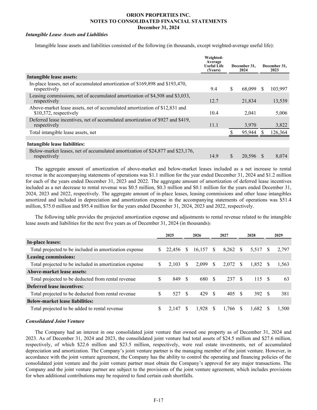 Intangible Lease Assets and Liabilities Intangible lease assets and liabilities consisted of the following (in thousands, except weighted-average useful life): Weighted- Average Useful Life (Years) December 31, 2024 December 31, 2023 Intangible lease assets: In-place leases, net of accumulated amortization of $169,898 and $193,470, respectively 9.4 $ 68,099 $ 103,997 Leasing commissions, net of accumulated amortization of $4,508 and $3,033, respectively 12.7 21,834 13,539 Above-market lease assets, net of accumulated amortization of $12,831 and $10,372, respectively 10.4 2,041 5,006 Deferred lease incentives, net of accumulated amortization of $927 and $419, respectively 11.1 3,970 3,822 Total intangible lease assets, net $ 95,944 $ 126,364 Intangible lease liabilities: Below-market leases, net of accumulated amortization of $24,877 and $23,176, respectively 14.9 $ 20,596 $ 8,074 The aggregate amount of amortization of above-market and below-market leases included as a net increase to rental revenue in the accompanying statements of operations was $1.1 million for the year ended December 31, 2024 and $1.2 million for each of the years ended December 31, 2023 and 2022. The aggregate amount of amortization of deferred lease incentives included as a net decrease to rental revenue was $0.5 million, $0.3 million and $0.1 million for the years ended December 31, 2024, 2023 and 2022, respectively. The aggregate amount of in-place leases, leasing commissions and other lease intangibles amortized and included in depreciation and amortization expense in the accompanying statements of operations was $51.4 million, $75.0 million and $95.4 million for the years ended December 31, 2024, 2023 and 2022, respectively. The following table provides the projected amortization expense and adjustments to rental revenue related to the intangible lease assets and liabilities for the next five years as of December 31, 2024 (in thousands): 2025 2026 2027 2028 2029 In-place leases: Total projected to be included in amortization expense $ 22,456 $ 16,157 $ 8,262 $ 5,517 $ 2,797 Leasing commissions: Total projected to be included in amortization expense $ 2,103 $ 2,099 $ 2,072 $ 1,852 $ 1,563 Above-market lease assets: Total projected to be deducted from rental revenue $ 849 $ 680 $ 237 $ 115 $ 63 Deferred lease incentives: Total projected to be deducted from rental revenue $ 527 $ 429 $ 405 $ 392 $ 381 Below-market lease liabilities: Total projected to be added to rental revenue $ 2,147 $ 1,928 $ 1,766 $ 1,682 $ 1,500 Consolidated Joint Venture The Company had an interest in one consolidated joint venture that owned one property as of December 31, 2024 and 2023. As of December 31, 2024 and 2023, the consolidated joint venture had total assets of $24.5 million and $27.6 million, respectively, of which $22.6 million and $23.5 million, respectively, were real estate investments, net of accumulated depreciation and amortization. The Company’s joint venture partner is the managing member of the joint venture. However, in accordance with the joint venture agreement, the Company has the ability to control the operating and financing policies of the consolidated joint venture and the joint venture partner must obtain the Company’s approval for any major transactions. The Company and the joint venture partner are subject to the provisions of the joint venture agreement, which includes provisions for when additional contributions may be required to fund certain cash shortfalls. ORION PROPERTIES INC. NOTES TO CONSOLIDATED FINANCIAL STATEMENTS December 31, 2024 F-17