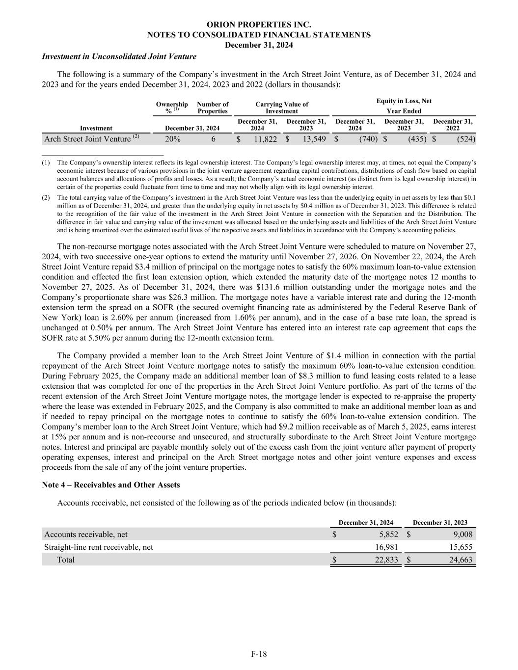Investment in Unconsolidated Joint Venture The following is a summary of the Company’s investment in the Arch Street Joint Venture, as of December 31, 2024 and 2023 and for the years ended December 31, 2024, 2023 and 2022 (dollars in thousands): Ownership % (1) Number of Properties Carrying Value of Investment Equity in Loss, Net Year Ended Investment December 31, 2024 December 31, 2024 December 31, 2023 December 31, 2024 December 31, 2023 December 31, 2022 Arch Street Joint Venture (2) 20% 6 $ 11,822 $ 13,549 $ (740) $ (435) $ (524) ____________________________________ (1) The Company’s ownership interest reflects its legal ownership interest. The Company’s legal ownership interest may, at times, not equal the Company’s economic interest because of various provisions in the joint venture agreement regarding capital contributions, distributions of cash flow based on capital account balances and allocations of profits and losses. As a result, the Company’s actual economic interest (as distinct from its legal ownership interest) in certain of the properties could fluctuate from time to time and may not wholly align with its legal ownership interest. (2) The total carrying value of the Company’s investment in the Arch Street Joint Venture was less than the underlying equity in net assets by less than $0.1 million as of December 31, 2024, and greater than the underlying equity in net assets by $0.4 million as of December 31, 2023. This difference is related to the recognition of the fair value of the investment in the Arch Street Joint Venture in connection with the Separation and the Distribution. The difference in fair value and carrying value of the investment was allocated based on the underlying assets and liabilities of the Arch Street Joint Venture and is being amortized over the estimated useful lives of the respective assets and liabilities in accordance with the Company’s accounting policies. The non-recourse mortgage notes associated with the Arch Street Joint Venture were scheduled to mature on November 27, 2024, with two successive one-year options to extend the maturity until November 27, 2026. On November 22, 2024, the Arch Street Joint Venture repaid $3.4 million of principal on the mortgage notes to satisfy the 60% maximum loan-to-value extension condition and effected the first loan extension option, which extended the maturity date of the mortgage notes 12 months to November 27, 2025. As of December 31, 2024, there was $131.6 million outstanding under the mortgage notes and the Company’s proportionate share was $26.3 million. The mortgage notes have a variable interest rate and during the 12-month extension term the spread on a SOFR (the secured overnight financing rate as administered by the Federal Reserve Bank of New York) loan is 2.60% per annum (increased from 1.60% per annum), and in the case of a base rate loan, the spread is unchanged at 0.50% per annum. The Arch Street Joint Venture has entered into an interest rate cap agreement that caps the SOFR rate at 5.50% per annum during the 12-month extension term. The Company provided a member loan to the Arch Street Joint Venture of $1.4 million in connection with the partial repayment of the Arch Street Joint Venture mortgage notes to satisfy the maximum 60% loan-to-value extension condition. During February 2025, the Company made an additional member loan of $8.3 million to fund leasing costs related to a lease extension that was completed for one of the properties in the Arch Street Joint Venture portfolio. As part of the terms of the recent extension of the Arch Street Joint Venture mortgage notes, the mortgage lender is expected to re-appraise the property where the lease was extended in February 2025, and the Company is also committed to make an additional member loan as and if needed to repay principal on the mortgage notes to continue to satisfy the 60% loan-to-value extension condition. The Company’s member loan to the Arch Street Joint Venture, which had $9.2 million receivable as of March 5, 2025, earns interest at 15% per annum and is non-recourse and unsecured, and structurally subordinate to the Arch Street Joint Venture mortgage notes. Interest and principal are payable monthly solely out of the excess cash from the joint venture after payment of property operating expenses, interest and principal on the Arch Street mortgage notes and other joint venture expenses and excess proceeds from the sale of any of the joint venture properties. Note 4 – Receivables and Other Assets Accounts receivable, net consisted of the following as of the periods indicated below (in thousands): December 31, 2024 December 31, 2023 Accounts receivable, net $ 5,852 $ 9,008 Straight-line rent receivable, net 16,981 15,655 Total $ 22,833 $ 24,663 ORION PROPERTIES INC. NOTES TO CONSOLIDATED FINANCIAL STATEMENTS December 31, 2024 F-18