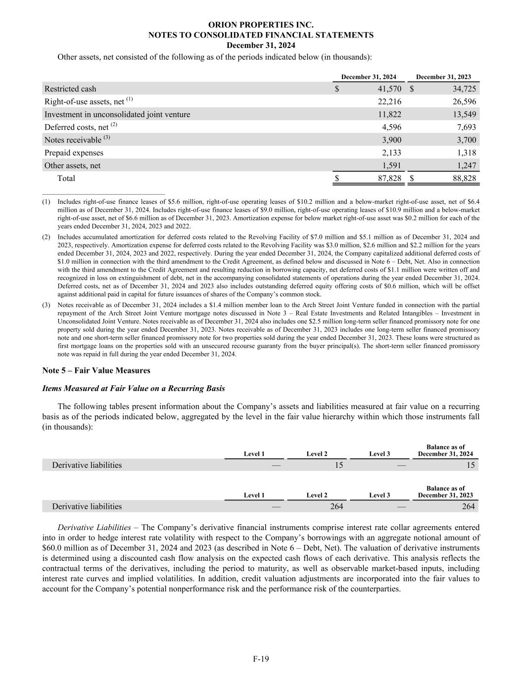 Other assets, net consisted of the following as of the periods indicated below (in thousands): December 31, 2024 December 31, 2023 Restricted cash $ 41,570 $ 34,725 Right-of-use assets, net (1) 22,216 26,596 Investment in unconsolidated joint venture 11,822 13,549 Deferred costs, net (2) 4,596 7,693 Notes receivable (3) 3,900 3,700 Prepaid expenses 2,133 1,318 Other assets, net 1,591 1,247 Total $ 87,828 $ 88,828 ____________________________________ (1) Includes right-of-use finance leases of $5.6 million, right-of-use operating leases of $10.2 million and a below-market right-of-use asset, net of $6.4 million as of December 31, 2024. Includes right-of-use finance leases of $9.0 million, right-of-use operating leases of $10.9 million and a below-market right-of-use asset, net of $6.6 million as of December 31, 2023. Amortization expense for below market right-of-use asset was $0.2 million for each of the years ended December 31, 2024, 2023 and 2022. (2) Includes accumulated amortization for deferred costs related to the Revolving Facility of $7.0 million and $5.1 million as of December 31, 2024 and 2023, respectively. Amortization expense for deferred costs related to the Revolving Facility was $3.0 million, $2.6 million and $2.2 million for the years ended December 31, 2024, 2023 and 2022, respectively. During the year ended December 31, 2024, the Company capitalized additional deferred costs of $1.0 million in connection with the third amendment to the Credit Agreement, as defined below and discussed in Note 6 – Debt, Net. Also in connection with the third amendment to the Credit Agreement and resulting reduction in borrowing capacity, net deferred costs of $1.1 million were written off and recognized in loss on extinguishment of debt, net in the accompanying consolidated statements of operations during the year ended December 31, 2024. Deferred costs, net as of December 31, 2024 and 2023 also includes outstanding deferred equity offering costs of $0.6 million, which will be offset against additional paid in capital for future issuances of shares of the Company’s common stock. (3) Notes receivable as of December 31, 2024 includes a $1.4 million member loan to the Arch Street Joint Venture funded in connection with the partial repayment of the Arch Street Joint Venture mortgage notes discussed in Note 3 – Real Estate Investments and Related Intangibles – Investment in Unconsolidated Joint Venture. Notes receivable as of December 31, 2024 also includes one $2.5 million long-term seller financed promissory note for one property sold during the year ended December 31, 2023. Notes receivable as of December 31, 2023 includes one long-term seller financed promissory note and one short-term seller financed promissory note for two properties sold during the year ended December 31, 2023. These loans were structured as first mortgage loans on the properties sold with an unsecured recourse guaranty from the buyer principal(s). The short-term seller financed promissory note was repaid in full during the year ended December 31, 2024. Note 5 – Fair Value Measures Items Measured at Fair Value on a Recurring Basis The following tables present information about the Company’s assets and liabilities measured at fair value on a recurring basis as of the periods indicated below, aggregated by the level in the fair value hierarchy within which those instruments fall (in thousands): Level 1 Level 2 Level 3 Balance as of December 31, 2024 Derivative liabilities — 15 — 15 Level 1 Level 2 Level 3 Balance as of December 31, 2023 Derivative liabilities — 264 — 264 Derivative Liabilities – The Company’s derivative financial instruments comprise interest rate collar agreements entered into in order to hedge interest rate volatility with respect to the Company’s borrowings with an aggregate notional amount of $60.0 million as of December 31, 2024 and 2023 (as described in Note 6 – Debt, Net). The valuation of derivative instruments is determined using a discounted cash flow analysis on the expected cash flows of each derivative. This analysis reflects the contractual terms of the derivatives, including the period to maturity, as well as observable market-based inputs, including interest rate curves and implied volatilities. In addition, credit valuation adjustments are incorporated into the fair values to account for the Company’s potential nonperformance risk and the performance risk of the counterparties. ORION PROPERTIES INC. NOTES TO CONSOLIDATED FINANCIAL STATEMENTS December 31, 2024 F-19