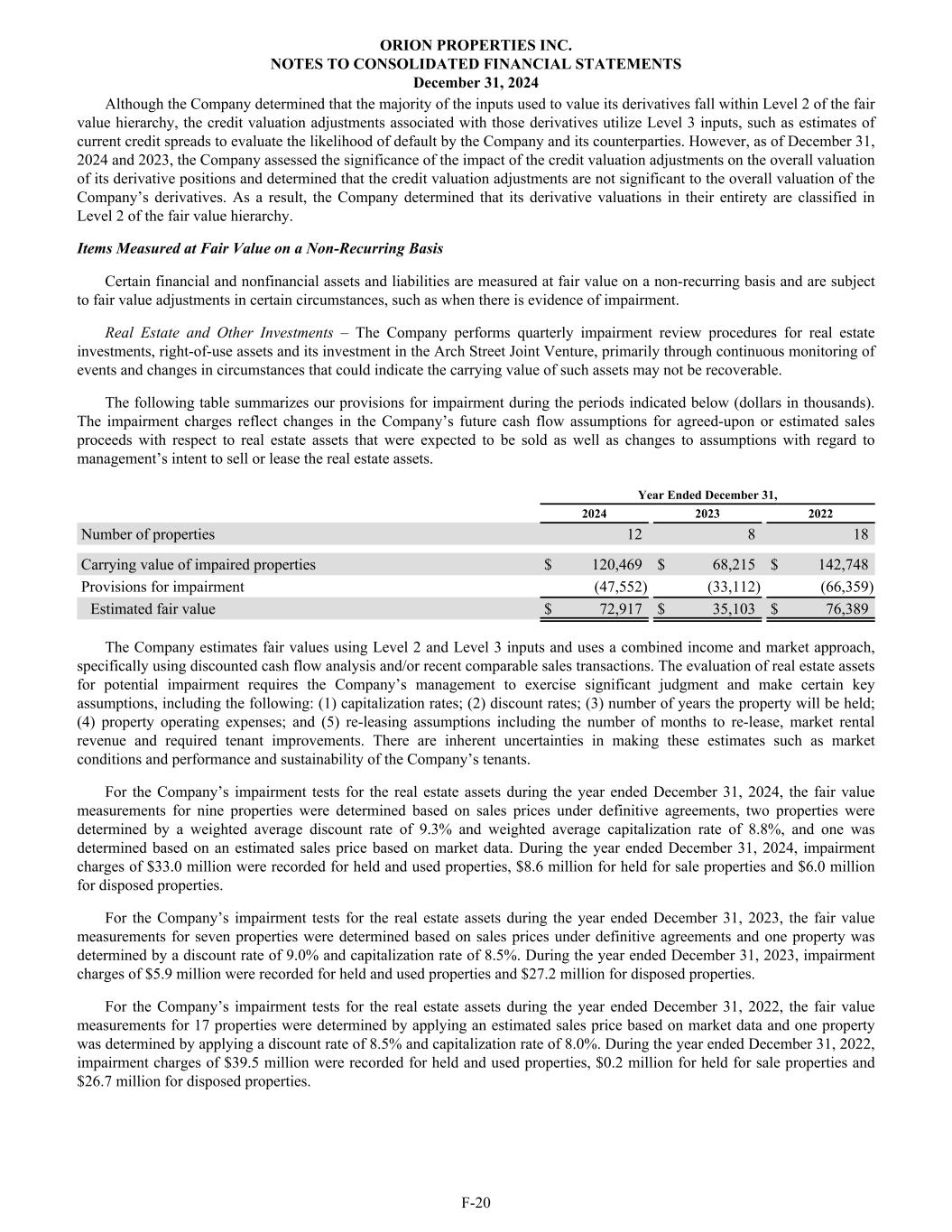 Although the Company determined that the majority of the inputs used to value its derivatives fall within Level 2 of the fair value hierarchy, the credit valuation adjustments associated with those derivatives utilize Level 3 inputs, such as estimates of current credit spreads to evaluate the likelihood of default by the Company and its counterparties. However, as of December 31, 2024 and 2023, the Company assessed the significance of the impact of the credit valuation adjustments on the overall valuation of its derivative positions and determined that the credit valuation adjustments are not significant to the overall valuation of the Company’s derivatives. As a result, the Company determined that its derivative valuations in their entirety are classified in Level 2 of the fair value hierarchy. Items Measured at Fair Value on a Non-Recurring Basis Certain financial and nonfinancial assets and liabilities are measured at fair value on a non-recurring basis and are subject to fair value adjustments in certain circumstances, such as when there is evidence of impairment. Real Estate and Other Investments – The Company performs quarterly impairment review procedures for real estate investments, right-of-use assets and its investment in the Arch Street Joint Venture, primarily through continuous monitoring of events and changes in circumstances that could indicate the carrying value of such assets may not be recoverable. The following table summarizes our provisions for impairment during the periods indicated below (dollars in thousands). The impairment charges reflect changes in the Company’s future cash flow assumptions for agreed-upon or estimated sales proceeds with respect to real estate assets that were expected to be sold as well as changes to assumptions with regard to management’s intent to sell or lease the real estate assets. Year Ended December 31, 2024 2023 2022 Number of properties 12 8 18 Carrying value of impaired properties $ 120,469 $ 68,215 $ 142,748 Provisions for impairment (47,552) (33,112) (66,359) Estimated fair value $ 72,917 $ 35,103 $ 76,389 The Company estimates fair values using Level 2 and Level 3 inputs and uses a combined income and market approach, specifically using discounted cash flow analysis and/or recent comparable sales transactions. The evaluation of real estate assets for potential impairment requires the Company’s management to exercise significant judgment and make certain key assumptions, including the following: (1) capitalization rates; (2) discount rates; (3) number of years the property will be held; (4) property operating expenses; and (5) re-leasing assumptions including the number of months to re-lease, market rental revenue and required tenant improvements. There are inherent uncertainties in making these estimates such as market conditions and performance and sustainability of the Company’s tenants. For the Company’s impairment tests for the real estate assets during the year ended December 31, 2024, the fair value measurements for nine properties were determined based on sales prices under definitive agreements, two properties were determined by a weighted average discount rate of 9.3% and weighted average capitalization rate of 8.8%, and one was determined based on an estimated sales price based on market data. During the year ended December 31, 2024, impairment charges of $33.0 million were recorded for held and used properties, $8.6 million for held for sale properties and $6.0 million for disposed properties. For the Company’s impairment tests for the real estate assets during the year ended December 31, 2023, the fair value measurements for seven properties were determined based on sales prices under definitive agreements and one property was determined by a discount rate of 9.0% and capitalization rate of 8.5%. During the year ended December 31, 2023, impairment charges of $5.9 million were recorded for held and used properties and $27.2 million for disposed properties. For the Company’s impairment tests for the real estate assets during the year ended December 31, 2022, the fair value measurements for 17 properties were determined by applying an estimated sales price based on market data and one property was determined by applying a discount rate of 8.5% and capitalization rate of 8.0%. During the year ended December 31, 2022, impairment charges of $39.5 million were recorded for held and used properties, $0.2 million for held for sale properties and $26.7 million for disposed properties. ORION PROPERTIES INC. NOTES TO CONSOLIDATED FINANCIAL STATEMENTS December 31, 2024 F-20