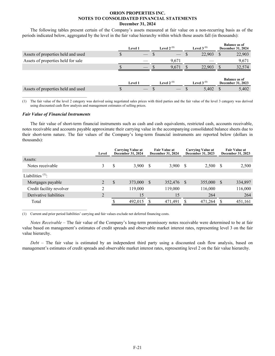 The following tables present certain of the Company’s assets measured at fair value on a non-recurring basis as of the periods indicated below, aggregated by the level in the fair value hierarchy within which those assets fall (in thousands): Level 1 Level 2 (1) Level 3 (1) Balance as of December 31, 2024 Assets of properties held and used $ — $ — $ 22,903 $ 22,903 Assets of properties held for sale — 9,671 — 9,671 $ — $ 9,671 $ 22,903 $ 32,574 Level 1 Level 2 (1) Level 3 (1) Balance as of December 31, 2023 Assets of properties held and used $ — $ — $ 5,402 $ 5,402 ____________________________________ (1) The fair value of the level 2 category was derived using negotiated sales prices with third parties and the fair value of the level 3 category was derived using discounted cash flow analysis and management estimates of selling prices. Fair Value of Financial Instruments The fair value of short-term financial instruments such as cash and cash equivalents, restricted cash, accounts receivable, notes receivable and accounts payable approximate their carrying value in the accompanying consolidated balance sheets due to their short-term nature. The fair values of the Company’s long-term financial instruments are reported below (dollars in thousands): Level Carrying Value at December 31, 2024 Fair Value at December 31, 2024 Carrying Value at December 31, 2023 Fair Value at December 31, 2023 Assets: Notes receivable 3 $ 3,900 $ 3,900 $ 2,500 $ 2,500 Liabilities (1): Mortgages payable 2 $ 373,000 $ 352,476 $ 355,000 $ 334,897 Credit facility revolver 2 119,000 119,000 116,000 116,000 Derivative liabilities 2 15 15 264 264 Total $ 492,015 $ 471,491 $ 471,264 $ 451,161 ____________________________________ (1) Current and prior period liabilities’ carrying and fair values exclude net deferred financing costs. Notes Receivable – The fair value of the Company’s long-term promissory notes receivable were determined to be at fair value based on management’s estimates of credit spreads and observable market interest rates, representing level 3 on the fair value hierarchy. Debt – The fair value is estimated by an independent third party using a discounted cash flow analysis, based on management’s estimates of credit spreads and observable market interest rates, representing level 2 on the fair value hierarchy. ORION PROPERTIES INC. NOTES TO CONSOLIDATED FINANCIAL STATEMENTS December 31, 2024 F-21