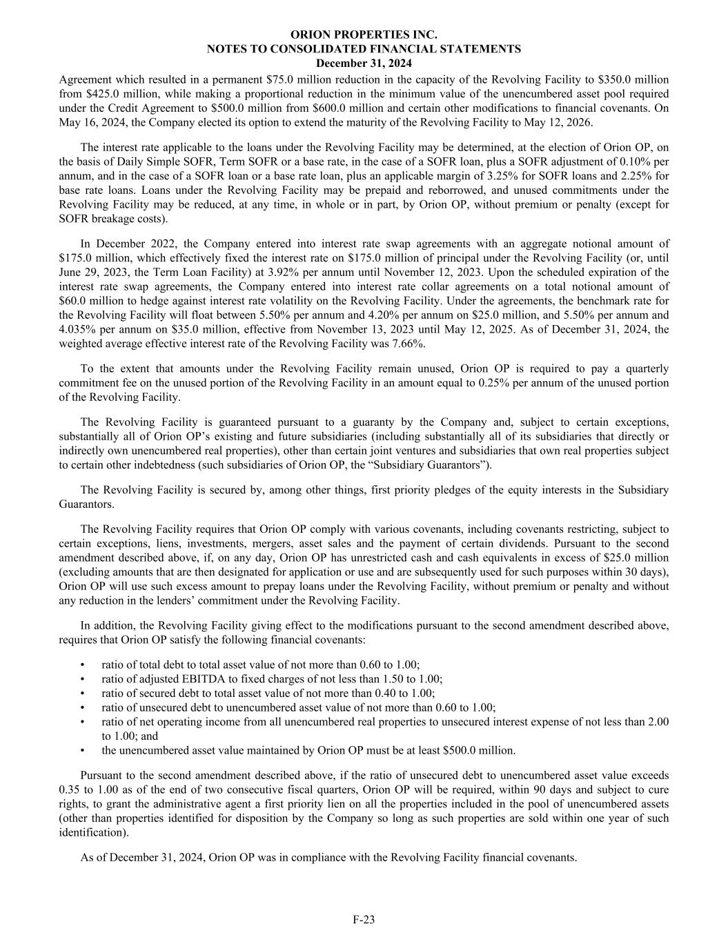 Agreement which resulted in a permanent $75.0 million reduction in the capacity of the Revolving Facility to $350.0 million from $425.0 million, while making a proportional reduction in the minimum value of the unencumbered asset pool required under the Credit Agreement to $500.0 million from $600.0 million and certain other modifications to financial covenants. On May 16, 2024, the Company elected its option to extend the maturity of the Revolving Facility to May 12, 2026. The interest rate applicable to the loans under the Revolving Facility may be determined, at the election of Orion OP, on the basis of Daily Simple SOFR, Term SOFR or a base rate, in the case of a SOFR loan, plus a SOFR adjustment of 0.10% per annum, and in the case of a SOFR loan or a base rate loan, plus an applicable margin of 3.25% for SOFR loans and 2.25% for base rate loans. Loans under the Revolving Facility may be prepaid and reborrowed, and unused commitments under the Revolving Facility may be reduced, at any time, in whole or in part, by Orion OP, without premium or penalty (except for SOFR breakage costs). In December 2022, the Company entered into interest rate swap agreements with an aggregate notional amount of $175.0 million, which effectively fixed the interest rate on $175.0 million of principal under the Revolving Facility (or, until June 29, 2023, the Term Loan Facility) at 3.92% per annum until November 12, 2023. Upon the scheduled expiration of the interest rate swap agreements, the Company entered into interest rate collar agreements on a total notional amount of $60.0 million to hedge against interest rate volatility on the Revolving Facility. Under the agreements, the benchmark rate for the Revolving Facility will float between 5.50% per annum and 4.20% per annum on $25.0 million, and 5.50% per annum and 4.035% per annum on $35.0 million, effective from November 13, 2023 until May 12, 2025. As of December 31, 2024, the weighted average effective interest rate of the Revolving Facility was 7.66%. To the extent that amounts under the Revolving Facility remain unused, Orion OP is required to pay a quarterly commitment fee on the unused portion of the Revolving Facility in an amount equal to 0.25% per annum of the unused portion of the Revolving Facility. The Revolving Facility is guaranteed pursuant to a guaranty by the Company and, subject to certain exceptions, substantially all of Orion OP’s existing and future subsidiaries (including substantially all of its subsidiaries that directly or indirectly own unencumbered real properties), other than certain joint ventures and subsidiaries that own real properties subject to certain other indebtedness (such subsidiaries of Orion OP, the “Subsidiary Guarantors”). The Revolving Facility is secured by, among other things, first priority pledges of the equity interests in the Subsidiary Guarantors. The Revolving Facility requires that Orion OP comply with various covenants, including covenants restricting, subject to certain exceptions, liens, investments, mergers, asset sales and the payment of certain dividends. Pursuant to the second amendment described above, if, on any day, Orion OP has unrestricted cash and cash equivalents in excess of $25.0 million (excluding amounts that are then designated for application or use and are subsequently used for such purposes within 30 days), Orion OP will use such excess amount to prepay loans under the Revolving Facility, without premium or penalty and without any reduction in the lenders’ commitment under the Revolving Facility. In addition, the Revolving Facility giving effect to the modifications pursuant to the second amendment described above, requires that Orion OP satisfy the following financial covenants: • ratio of total debt to total asset value of not more than 0.60 to 1.00; • ratio of adjusted EBITDA to fixed charges of not less than 1.50 to 1.00; • ratio of secured debt to total asset value of not more than 0.40 to 1.00; • ratio of unsecured debt to unencumbered asset value of not more than 0.60 to 1.00; • ratio of net operating income from all unencumbered real properties to unsecured interest expense of not less than 2.00 to 1.00; and • the unencumbered asset value maintained by Orion OP must be at least $500.0 million. Pursuant to the second amendment described above, if the ratio of unsecured debt to unencumbered asset value exceeds 0.35 to 1.00 as of the end of two consecutive fiscal quarters, Orion OP will be required, within 90 days and subject to cure rights, to grant the administrative agent a first priority lien on all the properties included in the pool of unencumbered assets (other than properties identified for disposition by the Company so long as such properties are sold within one year of such identification). As of December 31, 2024, Orion OP was in compliance with the Revolving Facility financial covenants. ORION PROPERTIES INC. NOTES TO CONSOLIDATED FINANCIAL STATEMENTS December 31, 2024 F-23