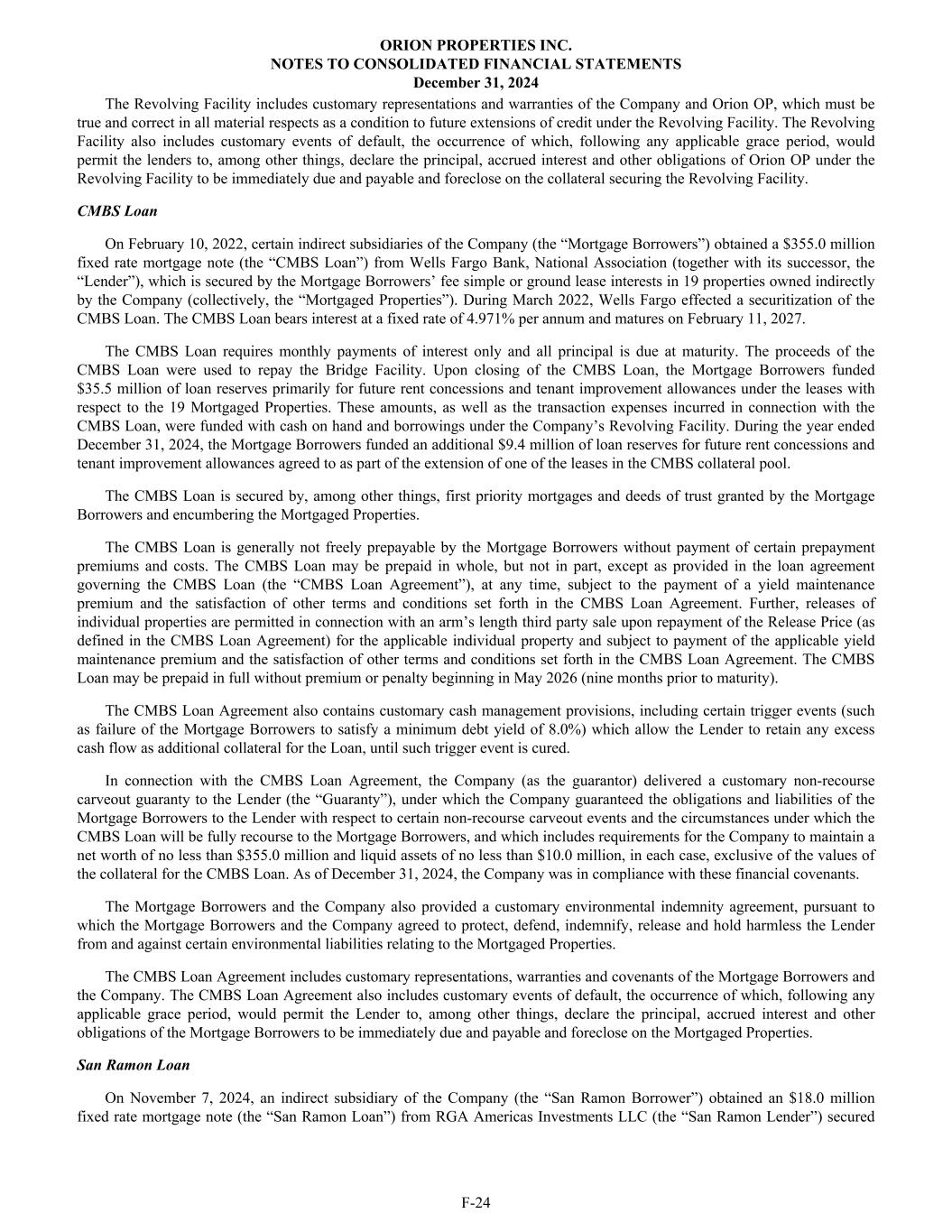 The Revolving Facility includes customary representations and warranties of the Company and Orion OP, which must be true and correct in all material respects as a condition to future extensions of credit under the Revolving Facility. The Revolving Facility also includes customary events of default, the occurrence of which, following any applicable grace period, would permit the lenders to, among other things, declare the principal, accrued interest and other obligations of Orion OP under the Revolving Facility to be immediately due and payable and foreclose on the collateral securing the Revolving Facility. CMBS Loan On February 10, 2022, certain indirect subsidiaries of the Company (the “Mortgage Borrowers”) obtained a $355.0 million fixed rate mortgage note (the “CMBS Loan”) from Wells Fargo Bank, National Association (together with its successor, the “Lender”), which is secured by the Mortgage Borrowers’ fee simple or ground lease interests in 19 properties owned indirectly by the Company (collectively, the “Mortgaged Properties”). During March 2022, Wells Fargo effected a securitization of the CMBS Loan. The CMBS Loan bears interest at a fixed rate of 4.971% per annum and matures on February 11, 2027. The CMBS Loan requires monthly payments of interest only and all principal is due at maturity. The proceeds of the CMBS Loan were used to repay the Bridge Facility. Upon closing of the CMBS Loan, the Mortgage Borrowers funded $35.5 million of loan reserves primarily for future rent concessions and tenant improvement allowances under the leases with respect to the 19 Mortgaged Properties. These amounts, as well as the transaction expenses incurred in connection with the CMBS Loan, were funded with cash on hand and borrowings under the Company’s Revolving Facility. During the year ended December 31, 2024, the Mortgage Borrowers funded an additional $9.4 million of loan reserves for future rent concessions and tenant improvement allowances agreed to as part of the extension of one of the leases in the CMBS collateral pool. The CMBS Loan is secured by, among other things, first priority mortgages and deeds of trust granted by the Mortgage Borrowers and encumbering the Mortgaged Properties. The CMBS Loan is generally not freely prepayable by the Mortgage Borrowers without payment of certain prepayment premiums and costs. The CMBS Loan may be prepaid in whole, but not in part, except as provided in the loan agreement governing the CMBS Loan (the “CMBS Loan Agreement”), at any time, subject to the payment of a yield maintenance premium and the satisfaction of other terms and conditions set forth in the CMBS Loan Agreement. Further, releases of individual properties are permitted in connection with an arm’s length third party sale upon repayment of the Release Price (as defined in the CMBS Loan Agreement) for the applicable individual property and subject to payment of the applicable yield maintenance premium and the satisfaction of other terms and conditions set forth in the CMBS Loan Agreement. The CMBS Loan may be prepaid in full without premium or penalty beginning in May 2026 (nine months prior to maturity). The CMBS Loan Agreement also contains customary cash management provisions, including certain trigger events (such as failure of the Mortgage Borrowers to satisfy a minimum debt yield of 8.0%) which allow the Lender to retain any excess cash flow as additional collateral for the Loan, until such trigger event is cured. In connection with the CMBS Loan Agreement, the Company (as the guarantor) delivered a customary non-recourse carveout guaranty to the Lender (the “Guaranty”), under which the Company guaranteed the obligations and liabilities of the Mortgage Borrowers to the Lender with respect to certain non-recourse carveout events and the circumstances under which the CMBS Loan will be fully recourse to the Mortgage Borrowers, and which includes requirements for the Company to maintain a net worth of no less than $355.0 million and liquid assets of no less than $10.0 million, in each case, exclusive of the values of the collateral for the CMBS Loan. As of December 31, 2024, the Company was in compliance with these financial covenants. The Mortgage Borrowers and the Company also provided a customary environmental indemnity agreement, pursuant to which the Mortgage Borrowers and the Company agreed to protect, defend, indemnify, release and hold harmless the Lender from and against certain environmental liabilities relating to the Mortgaged Properties. The CMBS Loan Agreement includes customary representations, warranties and covenants of the Mortgage Borrowers and the Company. The CMBS Loan Agreement also includes customary events of default, the occurrence of which, following any applicable grace period, would permit the Lender to, among other things, declare the principal, accrued interest and other obligations of the Mortgage Borrowers to be immediately due and payable and foreclose on the Mortgaged Properties. San Ramon Loan On November 7, 2024, an indirect subsidiary of the Company (the “San Ramon Borrower”) obtained an $18.0 million fixed rate mortgage note (the “San Ramon Loan”) from RGA Americas Investments LLC (the “San Ramon Lender”) secured ORION PROPERTIES INC. NOTES TO CONSOLIDATED FINANCIAL STATEMENTS December 31, 2024 F-24