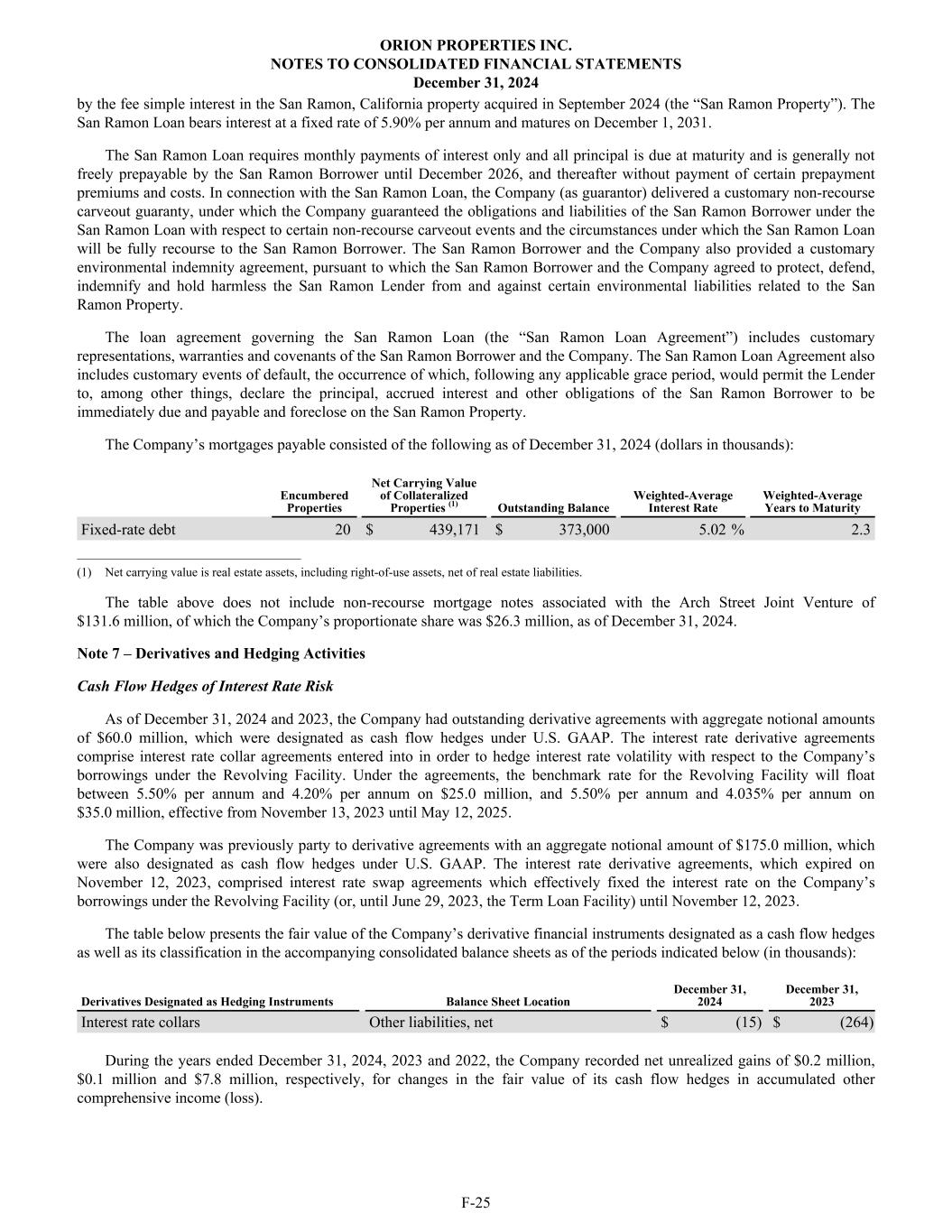 by the fee simple interest in the San Ramon, California property acquired in September 2024 (the “San Ramon Property”). The San Ramon Loan bears interest at a fixed rate of 5.90% per annum and matures on December 1, 2031. The San Ramon Loan requires monthly payments of interest only and all principal is due at maturity and is generally not freely prepayable by the San Ramon Borrower until December 2026, and thereafter without payment of certain prepayment premiums and costs. In connection with the San Ramon Loan, the Company (as guarantor) delivered a customary non-recourse carveout guaranty, under which the Company guaranteed the obligations and liabilities of the San Ramon Borrower under the San Ramon Loan with respect to certain non-recourse carveout events and the circumstances under which the San Ramon Loan will be fully recourse to the San Ramon Borrower. The San Ramon Borrower and the Company also provided a customary environmental indemnity agreement, pursuant to which the San Ramon Borrower and the Company agreed to protect, defend, indemnify and hold harmless the San Ramon Lender from and against certain environmental liabilities related to the San Ramon Property. The loan agreement governing the San Ramon Loan (the “San Ramon Loan Agreement”) includes customary representations, warranties and covenants of the San Ramon Borrower and the Company. The San Ramon Loan Agreement also includes customary events of default, the occurrence of which, following any applicable grace period, would permit the Lender to, among other things, declare the principal, accrued interest and other obligations of the San Ramon Borrower to be immediately due and payable and foreclose on the San Ramon Property. The Company’s mortgages payable consisted of the following as of December 31, 2024 (dollars in thousands): Encumbered Properties Net Carrying Value of Collateralized Properties (1) Outstanding Balance Weighted-Average Interest Rate Weighted-Average Years to Maturity Fixed-rate debt 20 $ 439,171 $ 373,000 5.02 % 2.3 ____________________________________ (1) Net carrying value is real estate assets, including right-of-use assets, net of real estate liabilities. The table above does not include non-recourse mortgage notes associated with the Arch Street Joint Venture of $131.6 million, of which the Company’s proportionate share was $26.3 million, as of December 31, 2024. Note 7 – Derivatives and Hedging Activities Cash Flow Hedges of Interest Rate Risk As of December 31, 2024 and 2023, the Company had outstanding derivative agreements with aggregate notional amounts of $60.0 million, which were designated as cash flow hedges under U.S. GAAP. The interest rate derivative agreements comprise interest rate collar agreements entered into in order to hedge interest rate volatility with respect to the Company’s borrowings under the Revolving Facility. Under the agreements, the benchmark rate for the Revolving Facility will float between 5.50% per annum and 4.20% per annum on $25.0 million, and 5.50% per annum and 4.035% per annum on $35.0 million, effective from November 13, 2023 until May 12, 2025. The Company was previously party to derivative agreements with an aggregate notional amount of $175.0 million, which were also designated as cash flow hedges under U.S. GAAP. The interest rate derivative agreements, which expired on November 12, 2023, comprised interest rate swap agreements which effectively fixed the interest rate on the Company’s borrowings under the Revolving Facility (or, until June 29, 2023, the Term Loan Facility) until November 12, 2023. The table below presents the fair value of the Company’s derivative financial instruments designated as a cash flow hedges as well as its classification in the accompanying consolidated balance sheets as of the periods indicated below (in thousands): Derivatives Designated as Hedging Instruments Balance Sheet Location December 31, 2024 December 31, 2023 Interest rate collars Other liabilities, net $ (15) $ (264) During the years ended December 31, 2024, 2023 and 2022, the Company recorded net unrealized gains of $0.2 million, $0.1 million and $7.8 million, respectively, for changes in the fair value of its cash flow hedges in accumulated other comprehensive income (loss). ORION PROPERTIES INC. NOTES TO CONSOLIDATED FINANCIAL STATEMENTS December 31, 2024 F-25