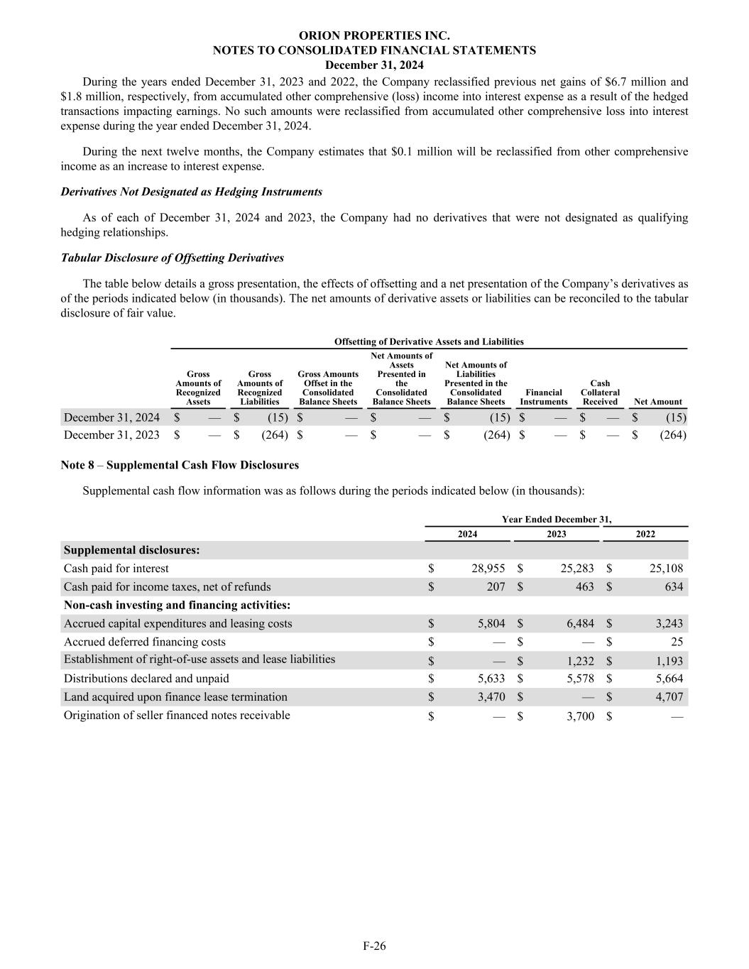 During the years ended December 31, 2023 and 2022, the Company reclassified previous net gains of $6.7 million and $1.8 million, respectively, from accumulated other comprehensive (loss) income into interest expense as a result of the hedged transactions impacting earnings. No such amounts were reclassified from accumulated other comprehensive loss into interest expense during the year ended December 31, 2024. During the next twelve months, the Company estimates that $0.1 million will be reclassified from other comprehensive income as an increase to interest expense. Derivatives Not Designated as Hedging Instruments As of each of December 31, 2024 and 2023, the Company had no derivatives that were not designated as qualifying hedging relationships. Tabular Disclosure of Offsetting Derivatives The table below details a gross presentation, the effects of offsetting and a net presentation of the Company’s derivatives as of the periods indicated below (in thousands). The net amounts of derivative assets or liabilities can be reconciled to the tabular disclosure of fair value. Offsetting of Derivative Assets and Liabilities Gross Amounts of Recognized Assets Gross Amounts of Recognized Liabilities Gross Amounts Offset in the Consolidated Balance Sheets Net Amounts of Assets Presented in the Consolidated Balance Sheets Net Amounts of Liabilities Presented in the Consolidated Balance Sheets Financial Instruments Cash Collateral Received Net Amount December 31, 2024 $ — $ (15) $ — $ — $ (15) $ — $ — $ (15) December 31, 2023 $ — $ (264) $ — $ — $ (264) $ — $ — $ (264) Note 8 – Supplemental Cash Flow Disclosures Supplemental cash flow information was as follows during the periods indicated below (in thousands): Year Ended December 31, 2024 2023 2022 Supplemental disclosures: Cash paid for interest $ 28,955 $ 25,283 $ 25,108 Cash paid for income taxes, net of refunds $ 207 $ 463 $ 634 Non-cash investing and financing activities: Accrued capital expenditures and leasing costs $ 5,804 $ 6,484 $ 3,243 Accrued deferred financing costs $ — $ — $ 25 Establishment of right-of-use assets and lease liabilities $ — $ 1,232 $ 1,193 Distributions declared and unpaid $ 5,633 $ 5,578 $ 5,664 Land acquired upon finance lease termination $ 3,470 $ — $ 4,707 Origination of seller financed notes receivable $ — $ 3,700 $ — ORION PROPERTIES INC. NOTES TO CONSOLIDATED FINANCIAL STATEMENTS December 31, 2024 F-26