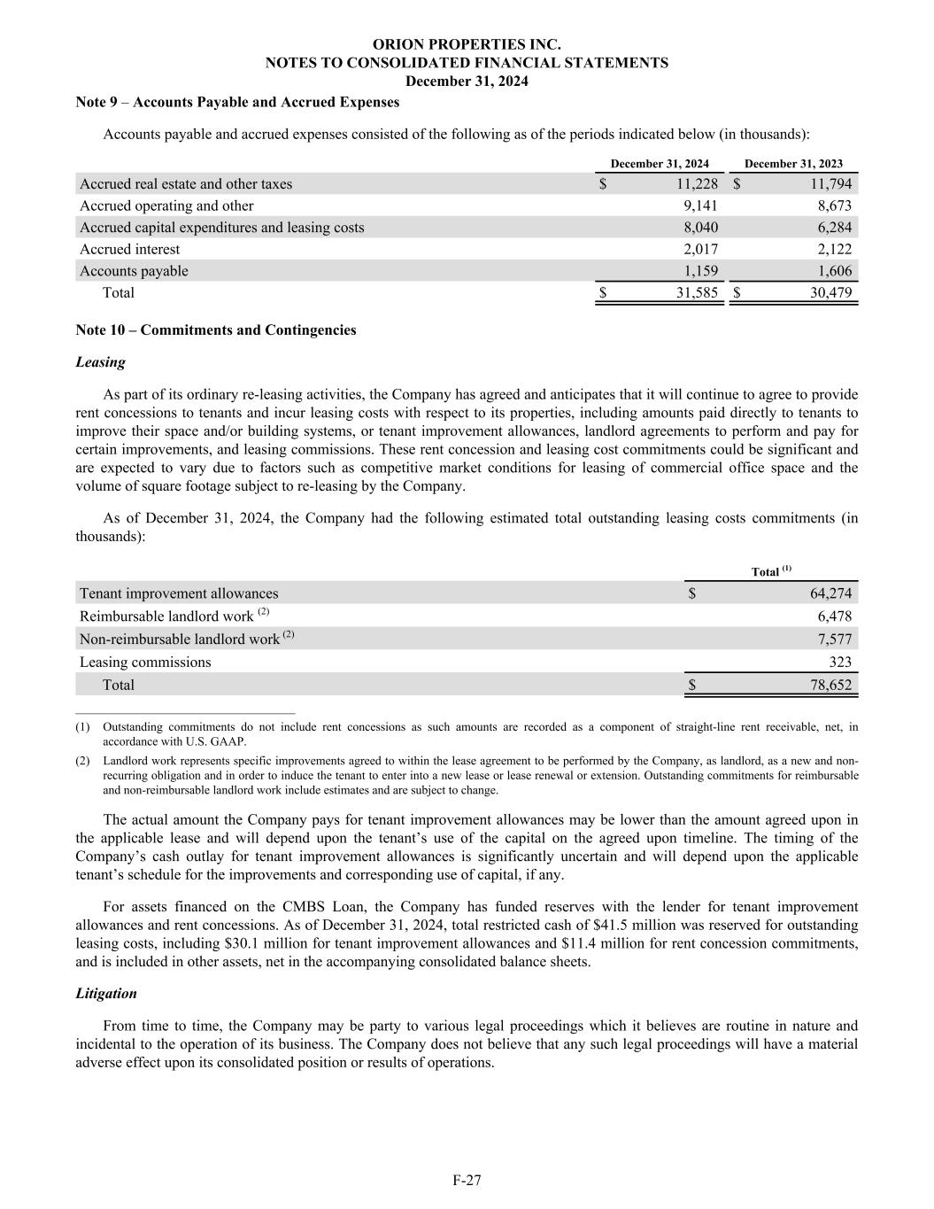 Note 9 – Accounts Payable and Accrued Expenses Accounts payable and accrued expenses consisted of the following as of the periods indicated below (in thousands): December 31, 2024 December 31, 2023 Accrued real estate and other taxes $ 11,228 $ 11,794 Accrued operating and other 9,141 8,673 Accrued capital expenditures and leasing costs 8,040 6,284 Accrued interest 2,017 2,122 Accounts payable 1,159 1,606 Total $ 31,585 $ 30,479 Note 10 – Commitments and Contingencies Leasing As part of its ordinary re-leasing activities, the Company has agreed and anticipates that it will continue to agree to provide rent concessions to tenants and incur leasing costs with respect to its properties, including amounts paid directly to tenants to improve their space and/or building systems, or tenant improvement allowances, landlord agreements to perform and pay for certain improvements, and leasing commissions. These rent concession and leasing cost commitments could be significant and are expected to vary due to factors such as competitive market conditions for leasing of commercial office space and the volume of square footage subject to re-leasing by the Company. As of December 31, 2024, the Company had the following estimated total outstanding leasing costs commitments (in thousands): Total (1) Tenant improvement allowances $ 64,274 Reimbursable landlord work (2) 6,478 Non-reimbursable landlord work (2) 7,577 Leasing commissions 323 Total $ 78,652 ____________________________________ (1) Outstanding commitments do not include rent concessions as such amounts are recorded as a component of straight-line rent receivable, net, in accordance with U.S. GAAP. (2) Landlord work represents specific improvements agreed to within the lease agreement to be performed by the Company, as landlord, as a new and non- recurring obligation and in order to induce the tenant to enter into a new lease or lease renewal or extension. Outstanding commitments for reimbursable and non-reimbursable landlord work include estimates and are subject to change. The actual amount the Company pays for tenant improvement allowances may be lower than the amount agreed upon in the applicable lease and will depend upon the tenant’s use of the capital on the agreed upon timeline. The timing of the Company’s cash outlay for tenant improvement allowances is significantly uncertain and will depend upon the applicable tenant’s schedule for the improvements and corresponding use of capital, if any. For assets financed on the CMBS Loan, the Company has funded reserves with the lender for tenant improvement allowances and rent concessions. As of December 31, 2024, total restricted cash of $41.5 million was reserved for outstanding leasing costs, including $30.1 million for tenant improvement allowances and $11.4 million for rent concession commitments, and is included in other assets, net in the accompanying consolidated balance sheets. Litigation From time to time, the Company may be party to various legal proceedings which it believes are routine in nature and incidental to the operation of its business. The Company does not believe that any such legal proceedings will have a material adverse effect upon its consolidated position or results of operations. ORION PROPERTIES INC. NOTES TO CONSOLIDATED FINANCIAL STATEMENTS December 31, 2024 F-27