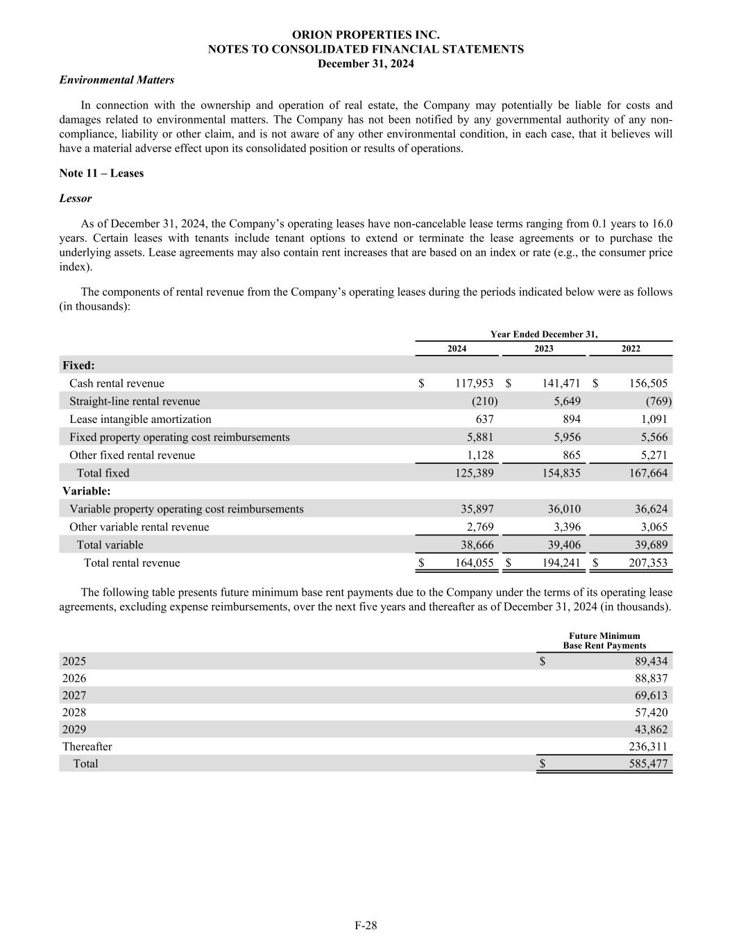 Environmental Matters In connection with the ownership and operation of real estate, the Company may potentially be liable for costs and damages related to environmental matters. The Company has not been notified by any governmental authority of any non- compliance, liability or other claim, and is not aware of any other environmental condition, in each case, that it believes will have a material adverse effect upon its consolidated position or results of operations. Note 11 – Leases Lessor As of December 31, 2024, the Company’s operating leases have non-cancelable lease terms ranging from 0.1 years to 16.0 years. Certain leases with tenants include tenant options to extend or terminate the lease agreements or to purchase the underlying assets. Lease agreements may also contain rent increases that are based on an index or rate (e.g., the consumer price index). The components of rental revenue from the Company’s operating leases during the periods indicated below were as follows (in thousands): Year Ended December 31, 2024 2023 2022 Fixed: Cash rental revenue $ 117,953 $ 141,471 $ 156,505 Straight-line rental revenue (210) 5,649 (769) Lease intangible amortization 637 894 1,091 Fixed property operating cost reimbursements 5,881 5,956 5,566 Other fixed rental revenue 1,128 865 5,271 Total fixed 125,389 154,835 167,664 Variable: Variable property operating cost reimbursements 35,897 36,010 36,624 Other variable rental revenue 2,769 3,396 3,065 Total variable 38,666 39,406 39,689 Total rental revenue $ 164,055 $ 194,241 $ 207,353 The following table presents future minimum base rent payments due to the Company under the terms of its operating lease agreements, excluding expense reimbursements, over the next five years and thereafter as of December 31, 2024 (in thousands). Future Minimum Base Rent Payments 2025 $ 89,434 2026 88,837 2027 69,613 2028 57,420 2029 43,862 Thereafter 236,311 Total $ 585,477 ORION PROPERTIES INC. NOTES TO CONSOLIDATED FINANCIAL STATEMENTS December 31, 2024 F-28