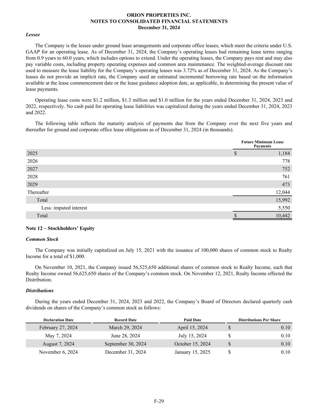 Lessee The Company is the lessee under ground lease arrangements and corporate office leases, which meet the criteria under U.S. GAAP for an operating lease. As of December 31, 2024, the Company’s operating leases had remaining lease terms ranging from 0.9 years to 60.0 years, which includes options to extend. Under the operating leases, the Company pays rent and may also pay variable costs, including property operating expenses and common area maintenance. The weighted-average discount rate used to measure the lease liability for the Company’s operating leases was 3.72% as of December 31, 2024. As the Company’s leases do not provide an implicit rate, the Company used an estimated incremental borrowing rate based on the information available at the lease commencement date or the lease guidance adoption date, as applicable, in determining the present value of lease payments. Operating lease costs were $1.2 million, $1.3 million and $1.0 million for the years ended December 31, 2024, 2023 and 2022, respectively. No cash paid for operating lease liabilities was capitalized during the years ended December 31, 2024, 2023 and 2022. The following table reflects the maturity analysis of payments due from the Company over the next five years and thereafter for ground and corporate office lease obligations as of December 31, 2024 (in thousands). Future Minimum Lease Payments 2025 $ 1,184 2026 778 2027 752 2028 761 2029 473 Thereafter 12,044 Total 15,992 Less: imputed interest 5,550 Total $ 10,442 Note 12 – Stockholders’ Equity Common Stock The Company was initially capitalized on July 15, 2021 with the issuance of 100,000 shares of common stock to Realty Income for a total of $1,000. On November 10, 2021, the Company issued 56,525,650 additional shares of common stock to Realty Income, such that Realty Income owned 56,625,650 shares of the Company’s common stock. On November 12, 2021, Realty Income effected the Distribution. Distributions During the years ended December 31, 2024, 2023 and 2022, the Company’s Board of Directors declared quarterly cash dividends on shares of the Company’s common stock as follows: Declaration Date Record Date Paid Date Distributions Per Share February 27, 2024 March 29, 2024 April 15, 2024 $ 0.10 May 7, 2024 June 28, 2024 July 15, 2024 $ 0.10 August 7, 2024 September 30, 2024 October 15, 2024 $ 0.10 November 6, 2024 December 31, 2024 January 15, 2025 $ 0.10 ORION PROPERTIES INC. NOTES TO CONSOLIDATED FINANCIAL STATEMENTS December 31, 2024 F-29
