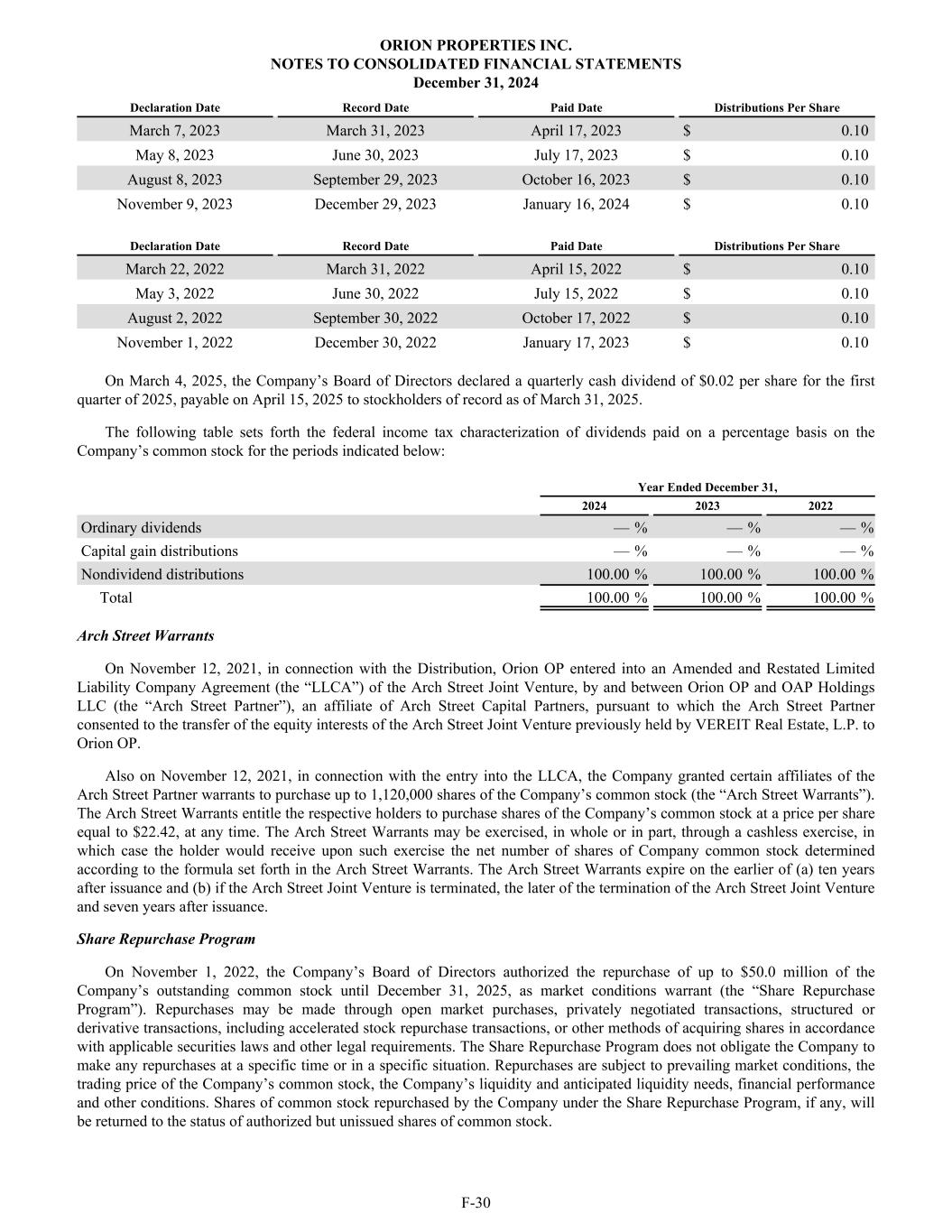 Declaration Date Record Date Paid Date Distributions Per Share March 7, 2023 March 31, 2023 April 17, 2023 $ 0.10 May 8, 2023 June 30, 2023 July 17, 2023 $ 0.10 August 8, 2023 September 29, 2023 October 16, 2023 $ 0.10 November 9, 2023 December 29, 2023 January 16, 2024 $ 0.10 Declaration Date Record Date Paid Date Distributions Per Share March 22, 2022 March 31, 2022 April 15, 2022 $ 0.10 May 3, 2022 June 30, 2022 July 15, 2022 $ 0.10 August 2, 2022 September 30, 2022 October 17, 2022 $ 0.10 November 1, 2022 December 30, 2022 January 17, 2023 $ 0.10 On March 4, 2025, the Company’s Board of Directors declared a quarterly cash dividend of $0.02 per share for the first quarter of 2025, payable on April 15, 2025 to stockholders of record as of March 31, 2025. The following table sets forth the federal income tax characterization of dividends paid on a percentage basis on the Company’s common stock for the periods indicated below: Year Ended December 31, 2024 2023 2022 Ordinary dividends — % — % — % Capital gain distributions — % — % — % Nondividend distributions 100.00 % 100.00 % 100.00 % Total 100.00 % 100.00 % 100.00 % Arch Street Warrants On November 12, 2021, in connection with the Distribution, Orion OP entered into an Amended and Restated Limited Liability Company Agreement (the “LLCA”) of the Arch Street Joint Venture, by and between Orion OP and OAP Holdings LLC (the “Arch Street Partner”), an affiliate of Arch Street Capital Partners, pursuant to which the Arch Street Partner consented to the transfer of the equity interests of the Arch Street Joint Venture previously held by VEREIT Real Estate, L.P. to Orion OP. Also on November 12, 2021, in connection with the entry into the LLCA, the Company granted certain affiliates of the Arch Street Partner warrants to purchase up to 1,120,000 shares of the Company’s common stock (the “Arch Street Warrants”). The Arch Street Warrants entitle the respective holders to purchase shares of the Company’s common stock at a price per share equal to $22.42, at any time. The Arch Street Warrants may be exercised, in whole or in part, through a cashless exercise, in which case the holder would receive upon such exercise the net number of shares of Company common stock determined according to the formula set forth in the Arch Street Warrants. The Arch Street Warrants expire on the earlier of (a) ten years after issuance and (b) if the Arch Street Joint Venture is terminated, the later of the termination of the Arch Street Joint Venture and seven years after issuance. Share Repurchase Program On November 1, 2022, the Company’s Board of Directors authorized the repurchase of up to $50.0 million of the Company’s outstanding common stock until December 31, 2025, as market conditions warrant (the “Share Repurchase Program”). Repurchases may be made through open market purchases, privately negotiated transactions, structured or derivative transactions, including accelerated stock repurchase transactions, or other methods of acquiring shares in accordance with applicable securities laws and other legal requirements. The Share Repurchase Program does not obligate the Company to make any repurchases at a specific time or in a specific situation. Repurchases are subject to prevailing market conditions, the trading price of the Company’s common stock, the Company’s liquidity and anticipated liquidity needs, financial performance and other conditions. Shares of common stock repurchased by the Company under the Share Repurchase Program, if any, will be returned to the status of authorized but unissued shares of common stock. ORION PROPERTIES INC. NOTES TO CONSOLIDATED FINANCIAL STATEMENTS December 31, 2024 F-30