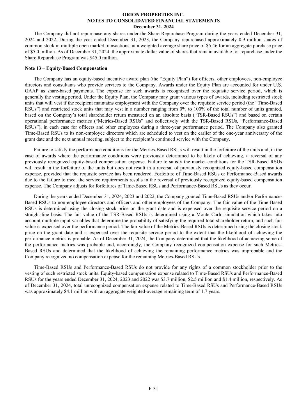 The Company did not repurchase any shares under the Share Repurchase Program during the years ended December 31, 2024 and 2022. During the year ended December 31, 2023, the Company repurchased approximately 0.9 million shares of common stock in multiple open market transactions, at a weighted average share price of $5.46 for an aggregate purchase price of $5.0 million. As of December 31, 2024, the approximate dollar value of shares that remain available for repurchase under the Share Repurchase Program was $45.0 million. Note 13 – Equity-Based Compensation The Company has an equity-based incentive award plan (the “Equity Plan”) for officers, other employees, non-employee directors and consultants who provide services to the Company. Awards under the Equity Plan are accounted for under U.S. GAAP as share-based payments. The expense for such awards is recognized over the requisite service period, which is generally the vesting period. Under the Equity Plan, the Company may grant various types of awards, including restricted stock units that will vest if the recipient maintains employment with the Company over the requisite service period (the “Time-Based RSUs”) and restricted stock units that may vest in a number ranging from 0% to 100% of the total number of units granted, based on the Company’s total shareholder return measured on an absolute basis (“TSR-Based RSUs”) and based on certain operational performance metrics (“Metrics-Based RSUs” and collectively with the TSR-Based RSUs, “Performance-Based RSUs”), in each case for officers and other employees during a three-year performance period. The Company also granted Time-Based RSUs to its non-employee directors which are scheduled to vest on the earlier of the one-year anniversary of the grant date and the next annual meeting, subject to the recipient’s continued service with the Company. Failure to satisfy the performance conditions for the Metrics-Based RSUs will result in the forfeiture of the units and, in the case of awards where the performance conditions were previously determined to be likely of achieving, a reversal of any previously recognized equity-based compensation expense. Failure to satisfy the market conditions for the TSR-Based RSUs will result in the forfeiture of the units but does not result in a reversal of previously recognized equity-based compensation expense, provided that the requisite service has been rendered. Forfeiture of Time-Based RSUs or Performance-Based awards due to the failure to meet the service requirements results in the reversal of previously recognized equity-based compensation expense. The Company adjusts for forfeitures of Time-Based RSUs and Performance-Based RSUs as they occur. During the years ended December 31, 2024, 2023 and 2022, the Company granted Time-Based RSUs and/or Performance- Based RSUs to non-employee directors and officers and other employees of the Company. The fair value of the Time-Based RSUs is determined using the closing stock price on the grant date and is expensed over the requisite service period on a straight-line basis. The fair value of the TSR-Based RSUs is determined using a Monte Carlo simulation which takes into account multiple input variables that determine the probability of satisfying the required total shareholder return, and such fair value is expensed over the performance period. The fair value of the Metrics-Based RSUs is determined using the closing stock price on the grant date and is expensed over the requisite service period to the extent that the likelihood of achieving the performance metrics is probable. As of December 31, 2024, the Company determined that the likelihood of achieving some of the performance metrics was probable and, accordingly, the Company recognized compensation expense for such Metrics- Based RSUs and determined that the likelihood of achieving the remaining performance metrics was improbable and the Company recognized no compensation expense for the remaining Metrics-Based RSUs. Time-Based RSUs and Performance-Based RSUs do not provide for any rights of a common stockholder prior to the vesting of such restricted stock units. Equity-based compensation expense related to Time-Based RSUs and Performance-Based RSUs for the years ended December 31, 2024, 2023 and 2022 was $3.7 million, $2.5 million and $1.4 million, respectively. As of December 31, 2024, total unrecognized compensation expense related to Time-Based RSUs and Performance-Based RSUs was approximately $4.1 million with an aggregate weighted-average remaining term of 1.7 years. ORION PROPERTIES INC. NOTES TO CONSOLIDATED FINANCIAL STATEMENTS December 31, 2024 F-31