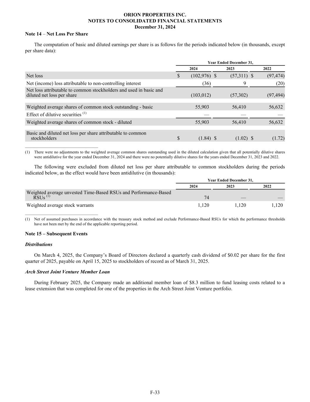 Note 14 – Net Loss Per Share The computation of basic and diluted earnings per share is as follows for the periods indicated below (in thousands, except per share data): Year Ended December 31, 2024 2023 2022 Net loss $ (102,976) $ (57,311) $ (97,474) Net (income) loss attributable to non-controlling interest (36) 9 (20) Net loss attributable to common stockholders and used in basic and diluted net loss per share (103,012) (57,302) (97,494) Weighted average shares of common stock outstanding - basic 55,903 56,410 56,632 Effect of dilutive securities (1) — — — Weighted average shares of common stock - diluted 55,903 56,410 56,632 Basic and diluted net loss per share attributable to common stockholders $ (1.84) $ (1.02) $ (1.72) ____________________________________ (1) There were no adjustments to the weighted average common shares outstanding used in the diluted calculation given that all potentially dilutive shares were antidilutive for the year ended December 31, 2024 and there were no potentially dilutive shares for the years ended December 31, 2023 and 2022. The following were excluded from diluted net loss per share attributable to common stockholders during the periods indicated below, as the effect would have been antidilutive (in thousands): Year Ended December 31, 2024 2023 2022 Weighted average unvested Time-Based RSUs and Performance-Based RSUs (1) 74 — — Weighted average stock warrants 1,120 1,120 1,120 ____________________________________ (1) Net of assumed purchases in accordance with the treasury stock method and exclude Performance-Based RSUs for which the performance thresholds have not been met by the end of the applicable reporting period. Note 15 – Subsequent Events Distributions On March 4, 2025, the Company’s Board of Directors declared a quarterly cash dividend of $0.02 per share for the first quarter of 2025, payable on April 15, 2025 to stockholders of record as of March 31, 2025. Arch Street Joint Venture Member Loan During February 2025, the Company made an additional member loan of $8.3 million to fund leasing costs related to a lease extension that was completed for one of the properties in the Arch Street Joint Venture portfolio. ORION PROPERTIES INC. NOTES TO CONSOLIDATED FINANCIAL STATEMENTS December 31, 2024 F-33