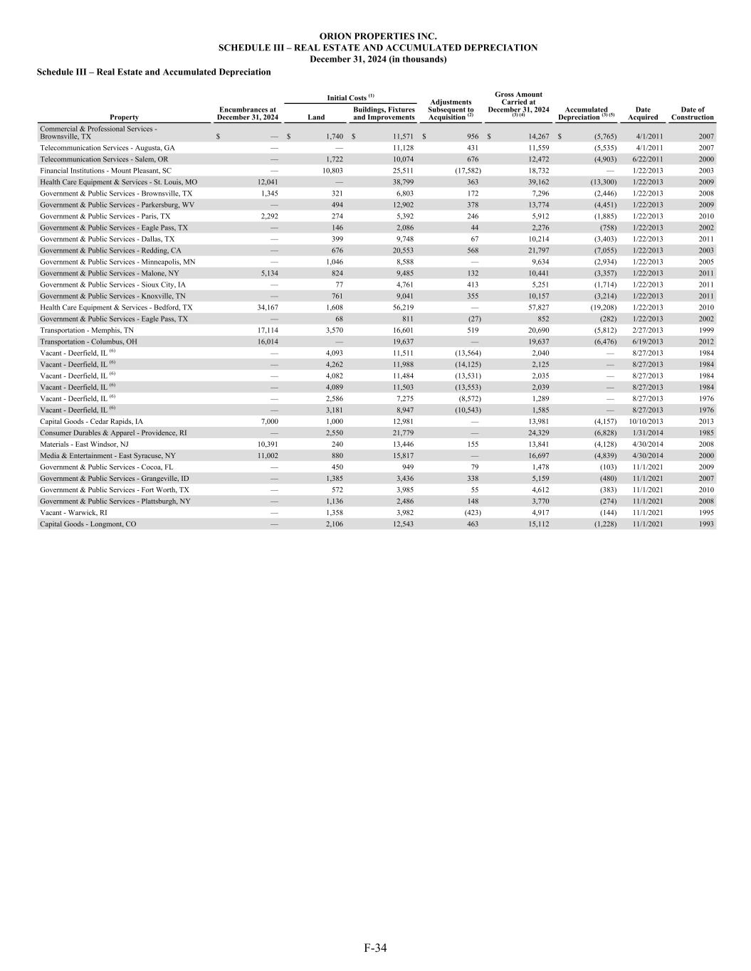 Schedule III – Real Estate and Accumulated Depreciation Commercial & Professional Services - Brownsville, TX $ — $ 1,740 $ 11,571 $ 956 $ 14,267 $ (5,765) 4/1/2011 2007 Telecommunication Services - Augusta, GA — — 11,128 431 11,559 (5,535) 4/1/2011 2007 Telecommunication Services - Salem, OR — 1,722 10,074 676 12,472 (4,903) 6/22/2011 2000 Financial Institutions - Mount Pleasant, SC — 10,803 25,511 (17,582) 18,732 — 1/22/2013 2003 Health Care Equipment & Services - St. Louis, MO 12,041 — 38,799 363 39,162 (13,300) 1/22/2013 2009 Government & Public Services - Brownsville, TX 1,345 321 6,803 172 7,296 (2,446) 1/22/2013 2008 Government & Public Services - Parkersburg, WV — 494 12,902 378 13,774 (4,451) 1/22/2013 2009 Government & Public Services - Paris, TX 2,292 274 5,392 246 5,912 (1,885) 1/22/2013 2010 Government & Public Services - Eagle Pass, TX — 146 2,086 44 2,276 (758) 1/22/2013 2002 Government & Public Services - Dallas, TX — 399 9,748 67 10,214 (3,403) 1/22/2013 2011 Government & Public Services - Redding, CA — 676 20,553 568 21,797 (7,055) 1/22/2013 2003 Government & Public Services - Minneapolis, MN — 1,046 8,588 — 9,634 (2,934) 1/22/2013 2005 Government & Public Services - Malone, NY 5,134 824 9,485 132 10,441 (3,357) 1/22/2013 2011 Government & Public Services - Sioux City, IA — 77 4,761 413 5,251 (1,714) 1/22/2013 2011 Government & Public Services - Knoxville, TN — 761 9,041 355 10,157 (3,214) 1/22/2013 2011 Health Care Equipment & Services - Bedford, TX 34,167 1,608 56,219 — 57,827 (19,208) 1/22/2013 2010 Government & Public Services - Eagle Pass, TX — 68 811 (27) 852 (282) 1/22/2013 2002 Transportation - Memphis, TN 17,114 3,570 16,601 519 20,690 (5,812) 2/27/2013 1999 Transportation - Columbus, OH 16,014 — 19,637 — 19,637 (6,476) 6/19/2013 2012 Vacant - Deerfield, IL (6) — 4,093 11,511 (13,564) 2,040 — 8/27/2013 1984 Vacant - Deerfield, IL (6) — 4,262 11,988 (14,125) 2,125 — 8/27/2013 1984 Vacant - Deerfield, IL (6) — 4,082 11,484 (13,531) 2,035 — 8/27/2013 1984 Vacant - Deerfield, IL (6) — 4,089 11,503 (13,553) 2,039 — 8/27/2013 1984 Vacant - Deerfield, IL (6) — 2,586 7,275 (8,572) 1,289 — 8/27/2013 1976 Vacant - Deerfield, IL (6) — 3,181 8,947 (10,543) 1,585 — 8/27/2013 1976 Capital Goods - Cedar Rapids, IA 7,000 1,000 12,981 — 13,981 (4,157) 10/10/2013 2013 Consumer Durables & Apparel - Providence, RI — 2,550 21,779 — 24,329 (6,828) 1/31/2014 1985 Materials - East Windsor, NJ 10,391 240 13,446 155 13,841 (4,128) 4/30/2014 2008 Media & Entertainment - East Syracuse, NY 11,002 880 15,817 — 16,697 (4,839) 4/30/2014 2000 Government & Public Services - Cocoa, FL — 450 949 79 1,478 (103) 11/1/2021 2009 Government & Public Services - Grangeville, ID — 1,385 3,436 338 5,159 (480) 11/1/2021 2007 Government & Public Services - Fort Worth, TX — 572 3,985 55 4,612 (383) 11/1/2021 2010 Government & Public Services - Plattsburgh, NY — 1,136 2,486 148 3,770 (274) 11/1/2021 2008 Vacant - Warwick, RI — 1,358 3,982 (423) 4,917 (144) 11/1/2021 1995 Capital Goods - Longmont, CO — 2,106 12,543 463 15,112 (1,228) 11/1/2021 1993 Initial Costs (1) Adjustments Acquisition Subsequent to (2) Gross Amount Carried at December 31, 2024 (3) (4) Accumulated Depreciation (3) (5)Property Encumbrances at December 31, 2024 Land Buildings, Fixtures and Improvements Date Acquired Date of Construction ORION PROPERTIES INC. SCHEDULE III – REAL ESTATE AND ACCUMULATED DEPRECIATION December 31, 2024 (in thousands) F-34