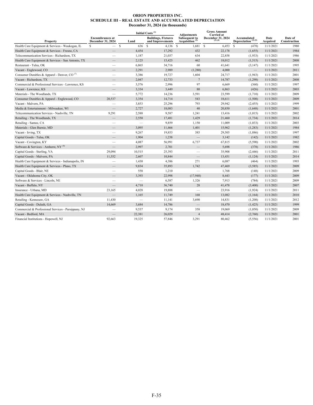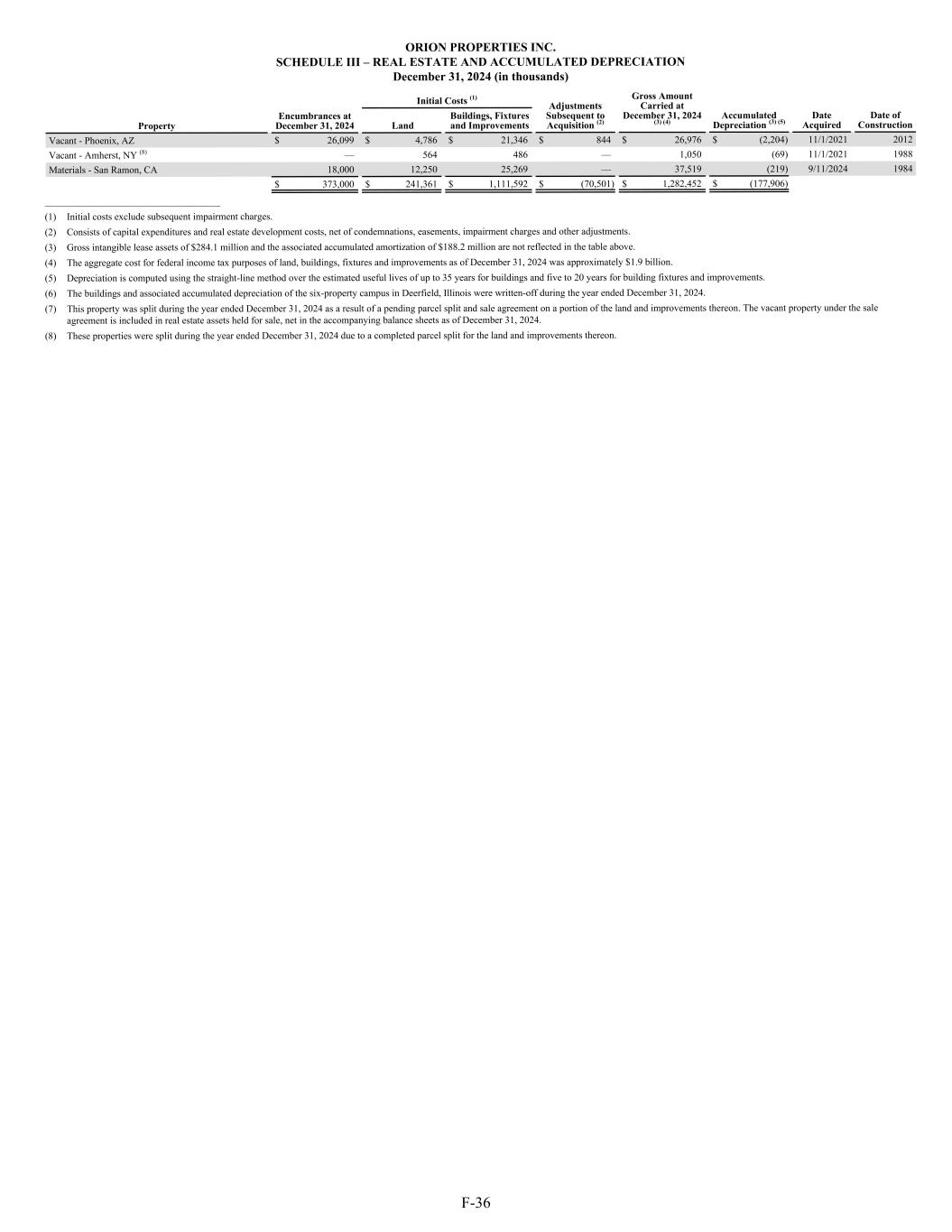 Health Care Equipment & Services - Waukegan, IL $ — $ 636 $ 4,136 $ 1,681 $ 6,453 $ (478) 11/1/2021 1980 Health Care Equipment & Services - Fresno, CA — 4,454 17,292 432 22,178 (1,655) 11/1/2021 1984 Telecommunication Services - Richardson, TX — 1,187 21,037 634 22,858 (1,933) 11/1/2021 1986 Health Care Equipment & Services - San Antonio, TX — 2,125 15,425 462 18,012 (1,515) 11/1/2021 2008 Restaurant - Tulsa, OK — 6,865 34,716 60 41,641 (3,147) 11/1/2021 1995 Vacant - Englewood, CO — 2,291 2,989 (1,280) 4,000 — 11/1/2021 2011 Consumer Durables & Apparel - Denver, CO (7) — 3,386 19,727 1,604 24,717 (1,943) 11/1/2021 2001 Vacant - Richardson, TX — 2,047 12,733 7 14,787 (1,298) 11/1/2021 2008 Commercial & Professional Services - Lawrence, KS — 3,576 2,996 97 6,669 (360) 11/1/2021 1997 Vacant - Lawrence, KS — 3,334 3,449 80 6,863 (426) 11/1/2021 2003 Materials - The Woodlands, TX — 5,772 14,236 3,591 23,599 (1,710) 11/1/2021 2009 Consumer Durables & Apparel - Englewood, CO 20,537 3,354 14,714 543 18,611 (1,508) 11/1/2021 2009 Vacant - Malvern, PA — 3,853 25,296 793 29,942 (2,455) 11/1/2021 1999 Media & Entertainment - Milwaukee, WI — 2,727 18,083 40 20,850 (1,648) 11/1/2021 2001 Telecommunication Services - Nashville, TN 9,291 2,588 9,587 1,241 13,416 (1,015) 11/1/2021 2002 Retailing - The Woodlands, TX — 2,550 17,481 1,429 21,460 (1,734) 11/1/2021 2014 Retailing - Santee, CA — — 9,859 1,150 11,009 (1,033) 11/1/2021 2003 Materials - Glen Burnie, MD — 3,095 11,466 1,401 15,962 (1,283) 11/1/2021 1984 Vacant - Irving, TX — 9,267 19,853 385 29,505 (1,886) 11/1/2021 1997 Capital Goods - Tulsa, OK — 1,904 1,238 — 3,142 (142) 11/1/2021 1982 Vacant - Covington, KY — 4,087 56,991 6,737 67,815 (5,590) 11/1/2021 2002 Software & Services - Amherst, NY (8) — 2,997 2,701 — 5,698 (378) 11/1/2021 1986 Capital Goods - Sterling, VA 29,094 10,515 25,393 — 35,908 (2,446) 11/1/2021 2011 Capital Goods - Malvern, PA 11,552 2,607 10,844 — 13,451 (1,124) 11/1/2021 2014 Health Care Equipment & Services - Indianapolis, IN — 1,430 4,386 271 6,087 (464) 11/1/2021 1993 Health Care Equipment & Services - Plano, TX — 9,834 35,893 1,742 47,469 (3,585) 11/1/2021 2009 Capital Goods - Blair, NE — 558 1,210 — 1,768 (148) 11/1/2021 2009 Vacant - Oklahoma City, OK — 3,393 22,998 (17,948) 8,443 (177) 11/1/2021 2009 Software & Services - Lincoln, NE — — 6,587 1,326 7,913 (784) 11/1/2021 2009 Vacant - Buffalo, NY — 4,710 36,740 28 41,478 (3,400) 11/1/2021 2007 Insurance - Urbana, MD 23,165 4,028 19,888 — 23,916 (1,924) 11/1/2021 2011 Health Care Equipment & Services - Nashville, TN — 1,165 11,749 168 13,082 (1,164) 11/1/2021 2010 Retailing - Kennesaw, GA 11,430 — 11,141 3,690 14,831 (1,208) 11/1/2021 2012 Capital Goods - Duluth, GA 14,669 3,684 14,786 — 18,470 (1,425) 11/1/2021 1999 Commercial & Professional Services - Parsippany, NJ — 9,537 9,174 358 19,069 (1,050) 11/1/2021 2009 Vacant - Bedford, MA — 22,381 26,029 4 48,414 (2,760) 11/1/2021 2001 Financial Institutions - Hopewell, NJ 92,663 19,325 57,846 3,291 80,462 (5,556) 11/1/2021 2001 Initial Costs (1) Adjustments Acquisition Subsequent to (2) Gross Amount Carried at December 31, 2024 (3) (4) Accumulated Depreciation (3) (5)Property Encumbrances at December 31, 2024 Land Buildings, Fixtures and Improvements Date Acquired Date of Construction ORION PROPERTIES INC. SCHEDULE III – REAL ESTATE AND ACCUMULATED DEPRECIATION December 31, 2024 (in thousands) F-35