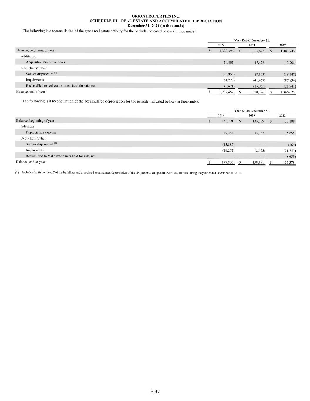 The following is a reconciliation of the gross real estate activity for the periods indicated below (in thousands): Year Ended December 31, 2024 2023 2022 Balance, beginning of year $ 1,320,396 $ 1,366,625 $ 1,481,745 Additions: Acquisitions/improvements 54,405 17,476 13,203 Deductions/Other Sold or disposed of (1) (20,955) (7,173) (18,548) Impairments (61,723) (41,467) (87,834) Reclassified to real estate assets held for sale, net (9,671) (15,065) (21,941) Balance, end of year $ 1,282,452 $ 1,320,396 $ 1,366,625 The following is a reconciliation of the accumulated depreciation for the periods indicated below (in thousands): Year Ended December 31, 2024 2023 2022 Balance, beginning of year $ 158,791 $ 133,379 $ 128,109 Additions: Depreciation expense 49,254 34,037 35,855 Deductions/Other Sold or disposed of (1) (15,887) — (169) Impairments (14,252) (8,625) (21,757) Reclassified to real estate assets held for sale, net — — (8,659) Balance, end of year $ 177,906 $ 158,791 $ 133,379 ____________________________________ (1) Includes the full write-off of the buildings and associated accumulated depreciation of the six-property campus in Deerfield, Illinois during the year ended December 31, 2024. ORION PROPERTIES INC. SCHEDULE III – REAL ESTATE AND ACCUMULATED DEPRECIATION December 31, 2024 (in thousands) F-37