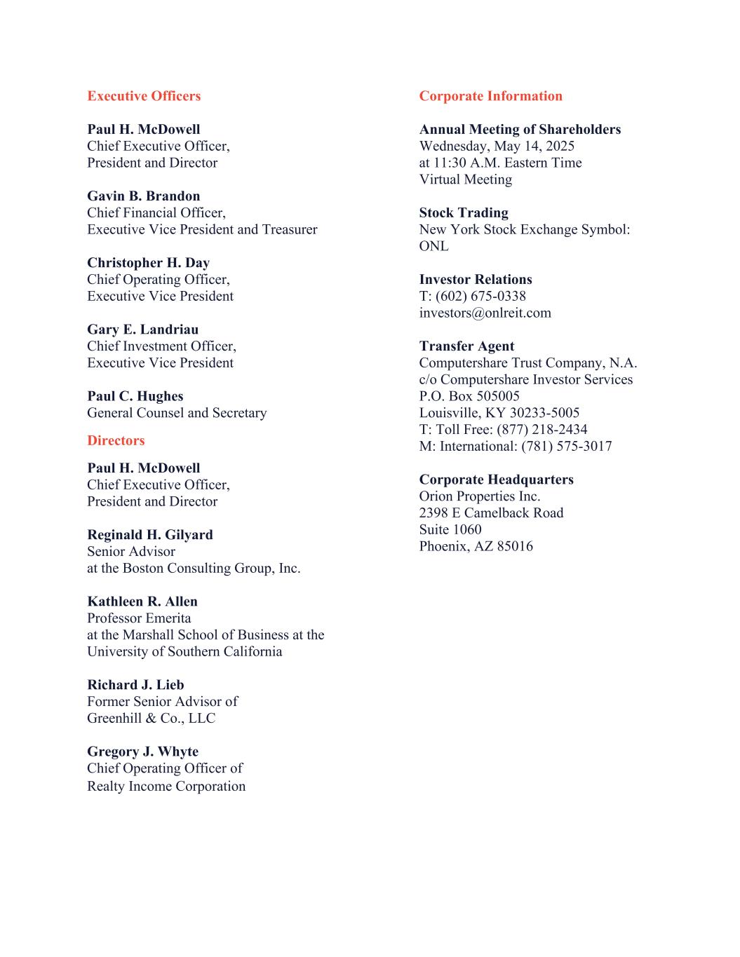 Executive Officers Paul H. McDowell Chief Executive Officer, President and Director Gavin B. Brandon Chief Financial Officer, Executive Vice President and Treasurer Christopher H. Day Chief Operating Officer, Executive Vice President Gary E. Landriau Chief Investment Officer, Executive Vice President Paul C. Hughes General Counsel and Secretary Directors Paul H. McDowell Chief Executive Officer, President and Director Reginald H. Gilyard Senior Advisor at the Boston Consulting Group, Inc. Kathleen R. Allen Professor Emerita at the Marshall School of Business at the University of Southern California Richard J. Lieb Former Senior Advisor of Greenhill & Co., LLC Gregory J. Whyte Chief Operating Officer of Realty Income Corporation Corporate Information Annual Meeting of Shareholders Wednesday, May 14, 2025 at 11:30 A.M. Eastern Time Virtual Meeting Stock Trading New York Stock Exchange Symbol: ONL Investor Relations T: (602) 675-0338 investors@onlreit.com Transfer Agent Computershare Trust Company, N.A. c/o Computershare Investor Services P.O. Box 505005 Louisville, KY 30233-5005 T: Toll Free: (877) 218-2434 M: International: (781) 575-3017 Corporate Headquarters Orion Properties Inc. 2398 E Camelback Road Suite 1060 Phoenix, AZ 85016