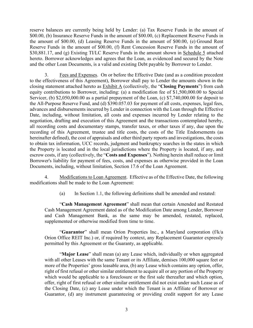 3 reserve balances are currently being held by Lender: (a) Tax Reserve Funds in the amount of $00.00, (b) Insurance Reserve Funds in the amount of $00.00, (c) Replacement Reserve Funds in the amount of $00.00, (d) Leasing Reserve Funds in the amount of $00.00, (e) Ground Rent Reserve Funds in the amount of $00.00, (f) Rent Concession Reserve Funds in the amount of $30,881.17, and (g) Existing TI/LC Reserve Funds in the amount shown in Schedule 5 attached hereto. Borrower acknowledges and agrees that the Loan, as evidenced and secured by the Note and the other Loan Documents, is a valid and existing Debt payable by Borrower to Lender. 3. Fees and Expenses. On or before the Effective Date (and as a condition precedent to the effectiveness of this Agreement), Borrower shall pay to Lender the amounts shown in the closing statement attached hereto as Exhibit A (collectively, the “Closing Payments”) from cash equity contributions to Borrower, including: (a) a modification fee of $1,500,000.00 to Special Servicer, (b) $2,050,000.00 as a partial prepayment of the Loan, (c) $7,740,000.00 for deposit to the All-Purpose Reserve Fund, and (d) $390.057.03 for payment of all costs, expenses, legal fees, advances and disbursements incurred by Lender in connection with the Loan through the Effective Date, including, without limitation, all costs and expenses incurred by Lender relating to the negotiation, drafting and execution of this Agreement and the transactions contemplated hereby, all recording costs and documentary stamps, transfer taxes, or other taxes if any, due upon the recording of this Agreement, trustee and title costs, the costs of the Title Endorsements (as hereinafter defined), the cost of appraisals and other third party reports and investigations, the costs to obtain tax information, UCC records, judgment and bankruptcy searches in the states in which the Property is located and in the local jurisdictions where the Property is located, if any, and escrow costs, if any (collectively, the “Costs and Expenses”). Nothing herein shall reduce or limit Borrower's liability for payment of fees, costs, and expenses as otherwise provided in the Loan Documents, including, without limitation, Section 17.6 of the Loan Agreement. 4. Modifications to Loan Agreement. Effective as of the Effective Date, the following modifications shall be made to the Loan Agreement: (a) In Section 1.1, the following definitions shall be amended and restated: “Cash Management Agreement” shall mean that certain Amended and Restated Cash Management Agreement dated as of the Modification Date among Lender, Borrower and Cash Management Bank, as the same may be amended, restated, replaced, supplemented or otherwise modified from time to time. “Guarantor” shall mean Orion Properties Inc., a Maryland corporation (f/k/a Orion Office REIT Inc.) or, if required by context, any Replacement Guarantor expressly permitted by this Agreement or the Guaranty, as applicable. “Major Lease” shall mean (a) any Lease which, individually or when aggregated with all other Leases with the same Tenant or its Affiliate, demises 100,000 square feet or more of the Properties’ gross leasable area, (b) any Lease which contains any option, offer, right of first refusal or other similar entitlement to acquire all or any portion of the Property which would be applicable to a foreclosure or the first sale thereafter and which option, offer, right of first refusal or other similar entitlement did not exist under such Lease as of the Closing Date, (c) any Lease under which the Tenant is an Affiliate of Borrower or Guarantor, (d) any instrument guaranteeing or providing credit support for any Lease