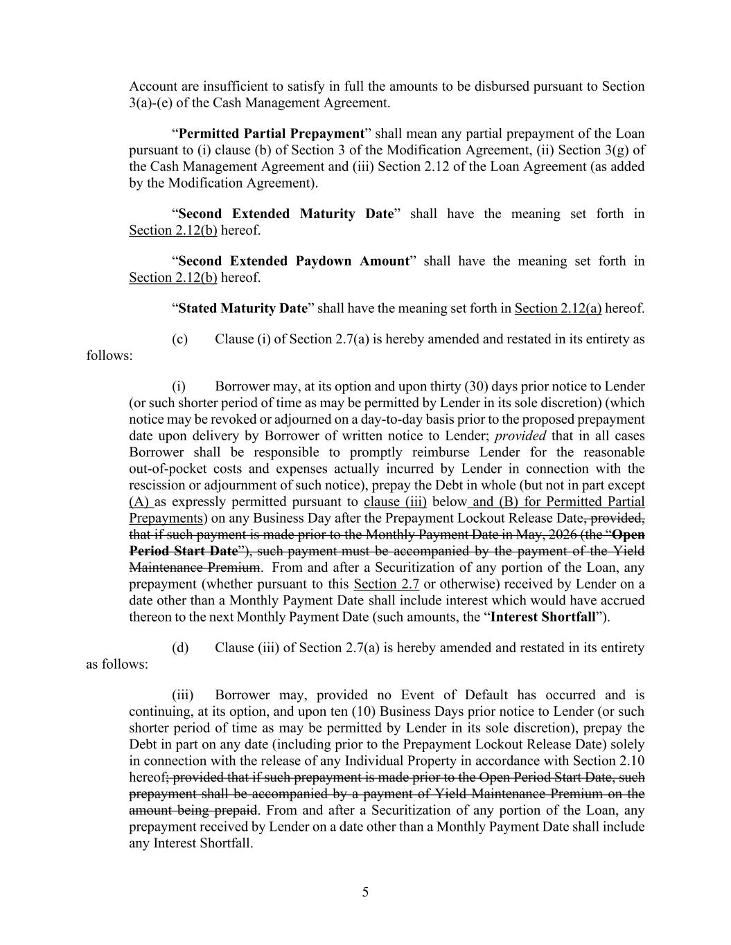 5 Account are insufficient to satisfy in full the amounts to be disbursed pursuant to Section 3(a)-(e) of the Cash Management Agreement. “Permitted Partial Prepayment” shall mean any partial prepayment of the Loan pursuant to (i) clause (b) of Section 3 of the Modification Agreement, (ii) Section 3(g) of the Cash Management Agreement and (iii) Section 2.12 of the Loan Agreement (as added by the Modification Agreement). “Second Extended Maturity Date” shall have the meaning set forth in Section 2.12(b) hereof. “Second Extended Paydown Amount” shall have the meaning set forth in Section 2.12(b) hereof. “Stated Maturity Date” shall have the meaning set forth in Section 2.12(a) hereof. (c) Clause (i) of Section 2.7(a) is hereby amended and restated in its entirety as follows: (i) Borrower may, at its option and upon thirty (30) days prior notice to Lender (or such shorter period of time as may be permitted by Lender in its sole discretion) (which notice may be revoked or adjourned on a day-to-day basis prior to the proposed prepayment date upon delivery by Borrower of written notice to Lender; provided that in all cases Borrower shall be responsible to promptly reimburse Lender for the reasonable out-of-pocket costs and expenses actually incurred by Lender in connection with the rescission or adjournment of such notice), prepay the Debt in whole (but not in part except (A) as expressly permitted pursuant to clause (iii) below and (B) for Permitted Partial Prepayments) on any Business Day after the Prepayment Lockout Release Date, provided, that if such payment is made prior to the Monthly Payment Date in May, 2026 (the “Open Period Start Date”), such payment must be accompanied by the payment of the Yield Maintenance Premium. From and after a Securitization of any portion of the Loan, any prepayment (whether pursuant to this Section 2.7 or otherwise) received by Lender on a date other than a Monthly Payment Date shall include interest which would have accrued thereon to the next Monthly Payment Date (such amounts, the “Interest Shortfall”). (d) Clause (iii) of Section 2.7(a) is hereby amended and restated in its entirety as follows: (iii) Borrower may, provided no Event of Default has occurred and is continuing, at its option, and upon ten (10) Business Days prior notice to Lender (or such shorter period of time as may be permitted by Lender in its sole discretion), prepay the Debt in part on any date (including prior to the Prepayment Lockout Release Date) solely in connection with the release of any Individual Property in accordance with Section 2.10 hereof; provided that if such prepayment is made prior to the Open Period Start Date, such prepayment shall be accompanied by a payment of Yield Maintenance Premium on the amount being prepaid. From and after a Securitization of any portion of the Loan, any prepayment received by Lender on a date other than a Monthly Payment Date shall include any Interest Shortfall.