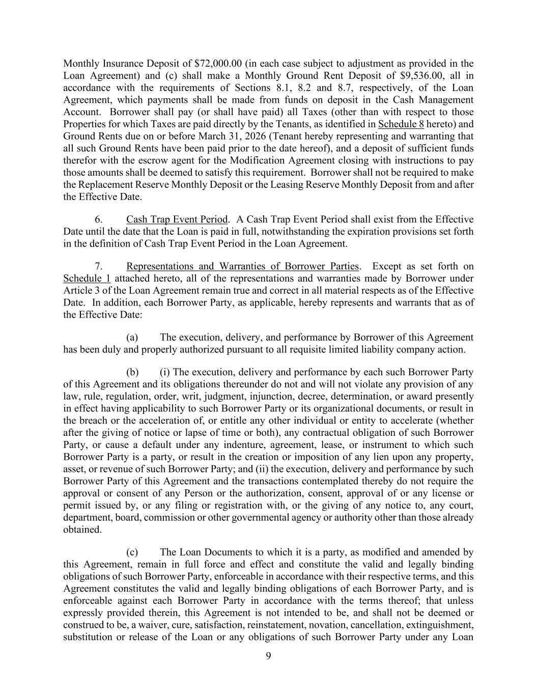 9 Monthly Insurance Deposit of $72,000.00 (in each case subject to adjustment as provided in the Loan Agreement) and (c) shall make a Monthly Ground Rent Deposit of $9,536.00, all in accordance with the requirements of Sections 8.1, 8.2 and 8.7, respectively, of the Loan Agreement, which payments shall be made from funds on deposit in the Cash Management Account. Borrower shall pay (or shall have paid) all Taxes (other than with respect to those Properties for which Taxes are paid directly by the Tenants, as identified in Schedule 8 hereto) and Ground Rents due on or before March 31, 2026 (Tenant hereby representing and warranting that all such Ground Rents have been paid prior to the date hereof), and a deposit of sufficient funds therefor with the escrow agent for the Modification Agreement closing with instructions to pay those amounts shall be deemed to satisfy this requirement. Borrower shall not be required to make the Replacement Reserve Monthly Deposit or the Leasing Reserve Monthly Deposit from and after the Effective Date. 6. Cash Trap Event Period. A Cash Trap Event Period shall exist from the Effective Date until the date that the Loan is paid in full, notwithstanding the expiration provisions set forth in the definition of Cash Trap Event Period in the Loan Agreement. 7. Representations and Warranties of Borrower Parties. Except as set forth on Schedule 1 attached hereto, all of the representations and warranties made by Borrower under Article 3 of the Loan Agreement remain true and correct in all material respects as of the Effective Date. In addition, each Borrower Party, as applicable, hereby represents and warrants that as of the Effective Date: (a) The execution, delivery, and performance by Borrower of this Agreement has been duly and properly authorized pursuant to all requisite limited liability company action. (b) (i) The execution, delivery and performance by each such Borrower Party of this Agreement and its obligations thereunder do not and will not violate any provision of any law, rule, regulation, order, writ, judgment, injunction, decree, determination, or award presently in effect having applicability to such Borrower Party or its organizational documents, or result in the breach or the acceleration of, or entitle any other individual or entity to accelerate (whether after the giving of notice or lapse of time or both), any contractual obligation of such Borrower Party, or cause a default under any indenture, agreement, lease, or instrument to which such Borrower Party is a party, or result in the creation or imposition of any lien upon any property, asset, or revenue of such Borrower Party; and (ii) the execution, delivery and performance by such Borrower Party of this Agreement and the transactions contemplated thereby do not require the approval or consent of any Person or the authorization, consent, approval of or any license or permit issued by, or any filing or registration with, or the giving of any notice to, any court, department, board, commission or other governmental agency or authority other than those already obtained. (c) The Loan Documents to which it is a party, as modified and amended by this Agreement, remain in full force and effect and constitute the valid and legally binding obligations of such Borrower Party, enforceable in accordance with their respective terms, and this Agreement constitutes the valid and legally binding obligations of each Borrower Party, and is enforceable against each Borrower Party in accordance with the terms thereof; that unless expressly provided therein, this Agreement is not intended to be, and shall not be deemed or construed to be, a waiver, cure, satisfaction, reinstatement, novation, cancellation, extinguishment, substitution or release of the Loan or any obligations of such Borrower Party under any Loan