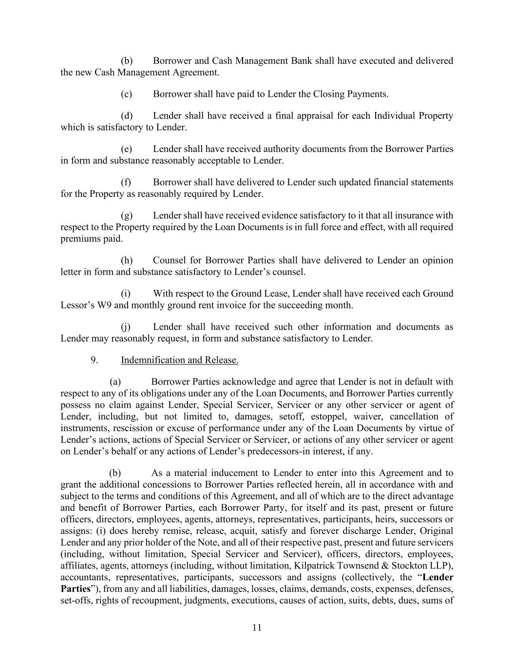 11 (b) Borrower and Cash Management Bank shall have executed and delivered the new Cash Management Agreement. (c) Borrower shall have paid to Lender the Closing Payments. (d) Lender shall have received a final appraisal for each Individual Property which is satisfactory to Lender. (e) Lender shall have received authority documents from the Borrower Parties in form and substance reasonably acceptable to Lender. (f) Borrower shall have delivered to Lender such updated financial statements for the Property as reasonably required by Lender. (g) Lender shall have received evidence satisfactory to it that all insurance with respect to the Property required by the Loan Documents is in full force and effect, with all required premiums paid. (h) Counsel for Borrower Parties shall have delivered to Lender an opinion letter in form and substance satisfactory to Lender’s counsel. (i) With respect to the Ground Lease, Lender shall have received each Ground Lessor’s W9 and monthly ground rent invoice for the succeeding month. (j) Lender shall have received such other information and documents as Lender may reasonably request, in form and substance satisfactory to Lender. 9. Indemnification and Release. (a) Borrower Parties acknowledge and agree that Lender is not in default with respect to any of its obligations under any of the Loan Documents, and Borrower Parties currently possess no claim against Lender, Special Servicer, Servicer or any other servicer or agent of Lender, including, but not limited to, damages, setoff, estoppel, waiver, cancellation of instruments, rescission or excuse of performance under any of the Loan Documents by virtue of Lender’s actions, actions of Special Servicer or Servicer, or actions of any other servicer or agent on Lender’s behalf or any actions of Lender’s predecessors-in interest, if any. (b) As a material inducement to Lender to enter into this Agreement and to grant the additional concessions to Borrower Parties reflected herein, all in accordance with and subject to the terms and conditions of this Agreement, and all of which are to the direct advantage and benefit of Borrower Parties, each Borrower Party, for itself and its past, present or future officers, directors, employees, agents, attorneys, representatives, participants, heirs, successors or assigns: (i) does hereby remise, release, acquit, satisfy and forever discharge Lender, Original Lender and any prior holder of the Note, and all of their respective past, present and future servicers (including, without limitation, Special Servicer and Servicer), officers, directors, employees, affiliates, agents, attorneys (including, without limitation, Kilpatrick Townsend & Stockton LLP), accountants, representatives, participants, successors and assigns (collectively, the “Lender Parties”), from any and all liabilities, damages, losses, claims, demands, costs, expenses, defenses, set-offs, rights of recoupment, judgments, executions, causes of action, suits, debts, dues, sums of