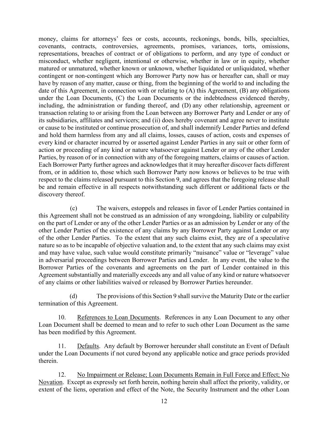 12 money, claims for attorneys’ fees or costs, accounts, reckonings, bonds, bills, specialties, covenants, contracts, controversies, agreements, promises, variances, torts, omissions, representations, breaches of contract or of obligations to perform, and any type of conduct or misconduct, whether negligent, intentional or otherwise, whether in law or in equity, whether matured or unmatured, whether known or unknown, whether liquidated or unliquidated, whether contingent or non-contingent which any Borrower Party now has or hereafter can, shall or may have by reason of any matter, cause or thing, from the beginning of the world to and including the date of this Agreement, in connection with or relating to (A) this Agreement, (B) any obligations under the Loan Documents, (C) the Loan Documents or the indebtedness evidenced thereby, including, the administration or funding thereof, and (D) any other relationship, agreement or transaction relating to or arising from the Loan between any Borrower Party and Lender or any of its subsidiaries, affiliates and servicers; and (ii) does hereby covenant and agree never to institute or cause to be instituted or continue prosecution of, and shall indemnify Lender Parties and defend and hold them harmless from any and all claims, losses, causes of action, costs and expenses of every kind or character incurred by or asserted against Lender Parties in any suit or other form of action or proceeding of any kind or nature whatsoever against Lender or any of the other Lender Parties, by reason of or in connection with any of the foregoing matters, claims or causes of action. Each Borrower Party further agrees and acknowledges that it may hereafter discover facts different from, or in addition to, those which such Borrower Party now knows or believes to be true with respect to the claims released pursuant to this Section 9, and agrees that the foregoing release shall be and remain effective in all respects notwithstanding such different or additional facts or the discovery thereof. (c) The waivers, estoppels and releases in favor of Lender Parties contained in this Agreement shall not be construed as an admission of any wrongdoing, liability or culpability on the part of Lender or any of the other Lender Parties or as an admission by Lender or any of the other Lender Parties of the existence of any claims by any Borrower Party against Lender or any of the other Lender Parties. To the extent that any such claims exist, they are of a speculative nature so as to be incapable of objective valuation and, to the extent that any such claims may exist and may have value, such value would constitute primarily “nuisance” value or “leverage” value in adversarial proceedings between Borrower Parties and Lender. In any event, the value to the Borrower Parties of the covenants and agreements on the part of Lender contained in this Agreement substantially and materially exceeds any and all value of any kind or nature whatsoever of any claims or other liabilities waived or released by Borrower Parties hereunder. (d) The provisions of this Section 9 shall survive the Maturity Date or the earlier termination of this Agreement. 10. References to Loan Documents. References in any Loan Document to any other Loan Document shall be deemed to mean and to refer to such other Loan Document as the same has been modified by this Agreement. 11. Defaults. Any default by Borrower hereunder shall constitute an Event of Default under the Loan Documents if not cured beyond any applicable notice and grace periods provided therein. 12. No Impairment or Release; Loan Documents Remain in Full Force and Effect; No Novation. Except as expressly set forth herein, nothing herein shall affect the priority, validity, or extent of the liens, operation and effect of the Note, the Security Instrument and the other Loan