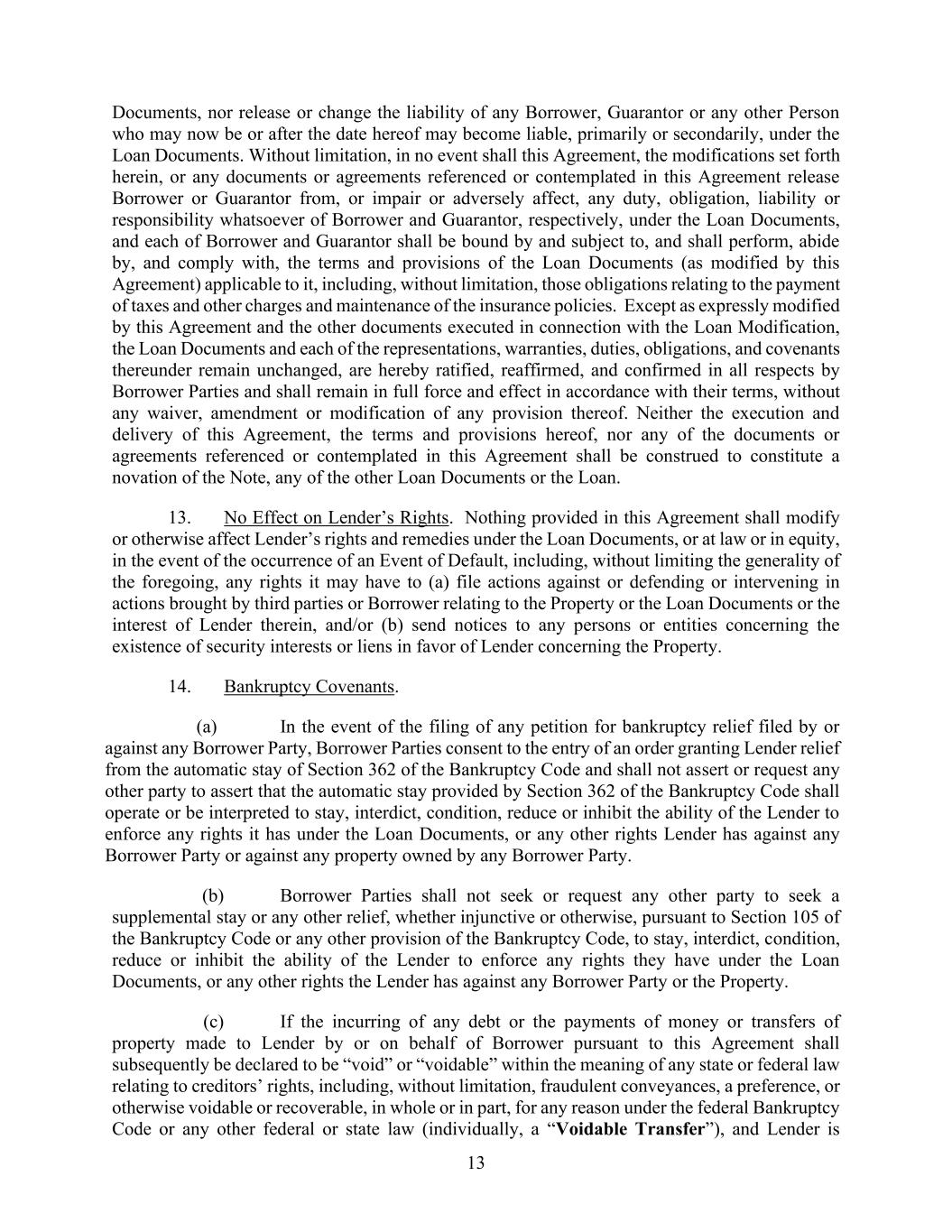 13 Documents, nor release or change the liability of any Borrower, Guarantor or any other Person who may now be or after the date hereof may become liable, primarily or secondarily, under the Loan Documents. Without limitation, in no event shall this Agreement, the modifications set forth herein, or any documents or agreements referenced or contemplated in this Agreement release Borrower or Guarantor from, or impair or adversely affect, any duty, obligation, liability or responsibility whatsoever of Borrower and Guarantor, respectively, under the Loan Documents, and each of Borrower and Guarantor shall be bound by and subject to, and shall perform, abide by, and comply with, the terms and provisions of the Loan Documents (as modified by this Agreement) applicable to it, including, without limitation, those obligations relating to the payment of taxes and other charges and maintenance of the insurance policies. Except as expressly modified by this Agreement and the other documents executed in connection with the Loan Modification, the Loan Documents and each of the representations, warranties, duties, obligations, and covenants thereunder remain unchanged, are hereby ratified, reaffirmed, and confirmed in all respects by Borrower Parties and shall remain in full force and effect in accordance with their terms, without any waiver, amendment or modification of any provision thereof. Neither the execution and delivery of this Agreement, the terms and provisions hereof, nor any of the documents or agreements referenced or contemplated in this Agreement shall be construed to constitute a novation of the Note, any of the other Loan Documents or the Loan. 13. No Effect on Lender’s Rights. Nothing provided in this Agreement shall modify or otherwise affect Lender’s rights and remedies under the Loan Documents, or at law or in equity, in the event of the occurrence of an Event of Default, including, without limiting the generality of the foregoing, any rights it may have to (a) file actions against or defending or intervening in actions brought by third parties or Borrower relating to the Property or the Loan Documents or the interest of Lender therein, and/or (b) send notices to any persons or entities concerning the existence of security interests or liens in favor of Lender concerning the Property. 14. Bankruptcy Covenants. (a) In the event of the filing of any petition for bankruptcy relief filed by or against any Borrower Party, Borrower Parties consent to the entry of an order granting Lender relief from the automatic stay of Section 362 of the Bankruptcy Code and shall not assert or request any other party to assert that the automatic stay provided by Section 362 of the Bankruptcy Code shall operate or be interpreted to stay, interdict, condition, reduce or inhibit the ability of the Lender to enforce any rights it has under the Loan Documents, or any other rights Lender has against any Borrower Party or against any property owned by any Borrower Party. (b) Borrower Parties shall not seek or request any other party to seek a supplemental stay or any other relief, whether injunctive or otherwise, pursuant to Section 105 of the Bankruptcy Code or any other provision of the Bankruptcy Code, to stay, interdict, condition, reduce or inhibit the ability of the Lender to enforce any rights they have under the Loan Documents, or any other rights the Lender has against any Borrower Party or the Property. (c) If the incurring of any debt or the payments of money or transfers of property made to Lender by or on behalf of Borrower pursuant to this Agreement shall subsequently be declared to be “void” or “voidable” within the meaning of any state or federal law relating to creditors’ rights, including, without limitation, fraudulent conveyances, a preference, or otherwise voidable or recoverable, in whole or in part, for any reason under the federal Bankruptcy Code or any other federal or state law (individually, a “Voidable Transfer”), and Lender is