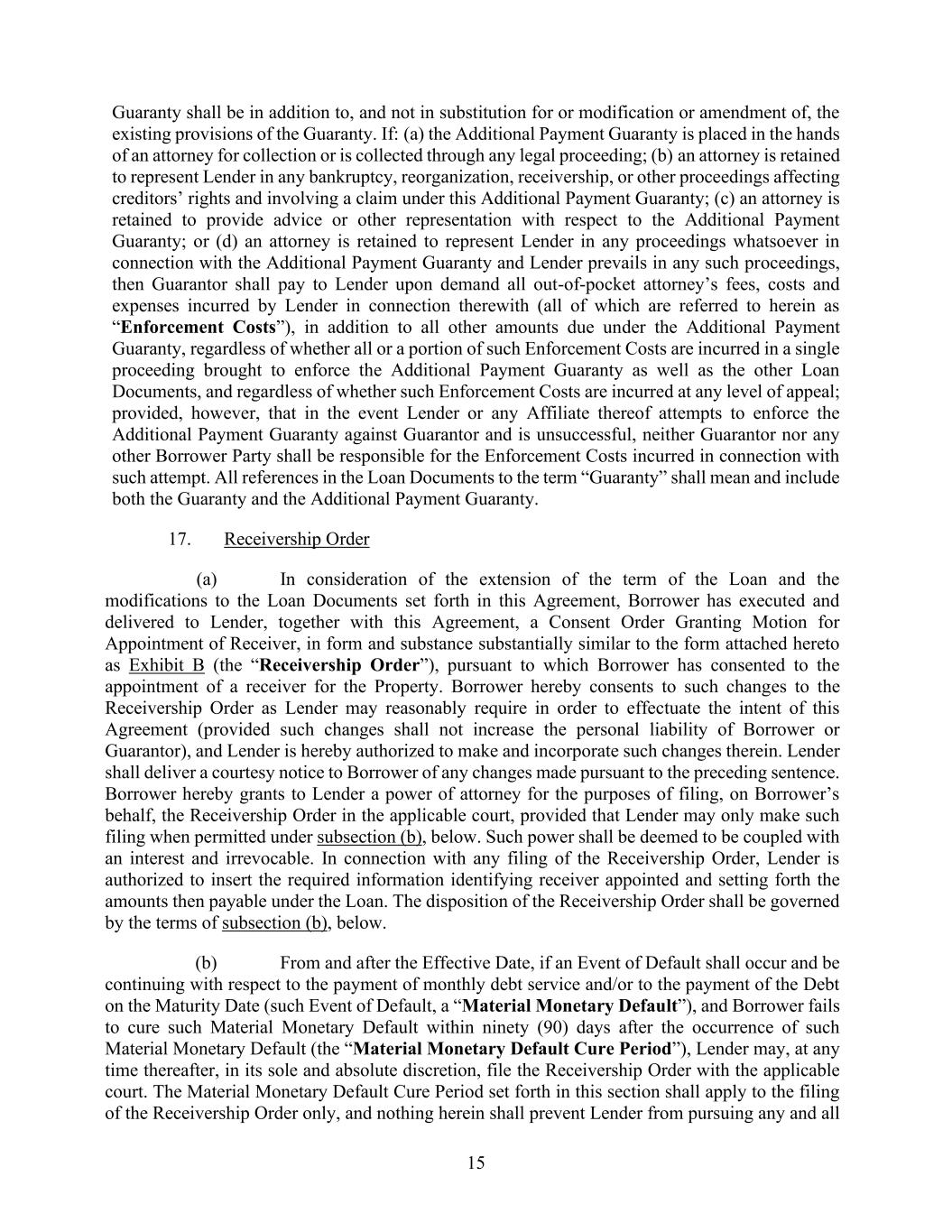 15 Guaranty shall be in addition to, and not in substitution for or modification or amendment of, the existing provisions of the Guaranty. If: (a) the Additional Payment Guaranty is placed in the hands of an attorney for collection or is collected through any legal proceeding; (b) an attorney is retained to represent Lender in any bankruptcy, reorganization, receivership, or other proceedings affecting creditors’ rights and involving a claim under this Additional Payment Guaranty; (c) an attorney is retained to provide advice or other representation with respect to the Additional Payment Guaranty; or (d) an attorney is retained to represent Lender in any proceedings whatsoever in connection with the Additional Payment Guaranty and Lender prevails in any such proceedings, then Guarantor shall pay to Lender upon demand all out-of-pocket attorney’s fees, costs and expenses incurred by Lender in connection therewith (all of which are referred to herein as “Enforcement Costs”), in addition to all other amounts due under the Additional Payment Guaranty, regardless of whether all or a portion of such Enforcement Costs are incurred in a single proceeding brought to enforce the Additional Payment Guaranty as well as the other Loan Documents, and regardless of whether such Enforcement Costs are incurred at any level of appeal; provided, however, that in the event Lender or any Affiliate thereof attempts to enforce the Additional Payment Guaranty against Guarantor and is unsuccessful, neither Guarantor nor any other Borrower Party shall be responsible for the Enforcement Costs incurred in connection with such attempt. All references in the Loan Documents to the term “Guaranty” shall mean and include both the Guaranty and the Additional Payment Guaranty. 17. Receivership Order (a) In consideration of the extension of the term of the Loan and the modifications to the Loan Documents set forth in this Agreement, Borrower has executed and delivered to Lender, together with this Agreement, a Consent Order Granting Motion for Appointment of Receiver, in form and substance substantially similar to the form attached hereto as Exhibit B (the “Receivership Order”), pursuant to which Borrower has consented to the appointment of a receiver for the Property. Borrower hereby consents to such changes to the Receivership Order as Lender may reasonably require in order to effectuate the intent of this Agreement (provided such changes shall not increase the personal liability of Borrower or Guarantor), and Lender is hereby authorized to make and incorporate such changes therein. Lender shall deliver a courtesy notice to Borrower of any changes made pursuant to the preceding sentence. Borrower hereby grants to Lender a power of attorney for the purposes of filing, on Borrower’s behalf, the Receivership Order in the applicable court, provided that Lender may only make such filing when permitted under subsection (b), below. Such power shall be deemed to be coupled with an interest and irrevocable. In connection with any filing of the Receivership Order, Lender is authorized to insert the required information identifying receiver appointed and setting forth the amounts then payable under the Loan. The disposition of the Receivership Order shall be governed by the terms of subsection (b), below. (b) From and after the Effective Date, if an Event of Default shall occur and be continuing with respect to the payment of monthly debt service and/or to the payment of the Debt on the Maturity Date (such Event of Default, a “Material Monetary Default”), and Borrower fails to cure such Material Monetary Default within ninety (90) days after the occurrence of such Material Monetary Default (the “Material Monetary Default Cure Period”), Lender may, at any time thereafter, in its sole and absolute discretion, file the Receivership Order with the applicable court. The Material Monetary Default Cure Period set forth in this section shall apply to the filing of the Receivership Order only, and nothing herein shall prevent Lender from pursuing any and all
