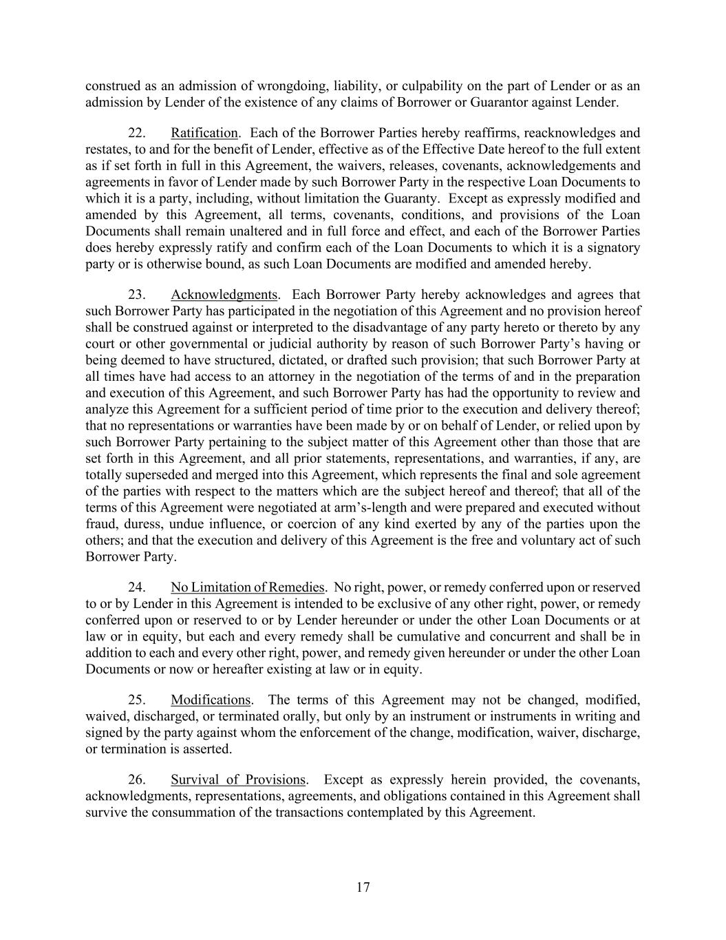 17 construed as an admission of wrongdoing, liability, or culpability on the part of Lender or as an admission by Lender of the existence of any claims of Borrower or Guarantor against Lender. 22. Ratification. Each of the Borrower Parties hereby reaffirms, reacknowledges and restates, to and for the benefit of Lender, effective as of the Effective Date hereof to the full extent as if set forth in full in this Agreement, the waivers, releases, covenants, acknowledgements and agreements in favor of Lender made by such Borrower Party in the respective Loan Documents to which it is a party, including, without limitation the Guaranty. Except as expressly modified and amended by this Agreement, all terms, covenants, conditions, and provisions of the Loan Documents shall remain unaltered and in full force and effect, and each of the Borrower Parties does hereby expressly ratify and confirm each of the Loan Documents to which it is a signatory party or is otherwise bound, as such Loan Documents are modified and amended hereby. 23. Acknowledgments. Each Borrower Party hereby acknowledges and agrees that such Borrower Party has participated in the negotiation of this Agreement and no provision hereof shall be construed against or interpreted to the disadvantage of any party hereto or thereto by any court or other governmental or judicial authority by reason of such Borrower Party’s having or being deemed to have structured, dictated, or drafted such provision; that such Borrower Party at all times have had access to an attorney in the negotiation of the terms of and in the preparation and execution of this Agreement, and such Borrower Party has had the opportunity to review and analyze this Agreement for a sufficient period of time prior to the execution and delivery thereof; that no representations or warranties have been made by or on behalf of Lender, or relied upon by such Borrower Party pertaining to the subject matter of this Agreement other than those that are set forth in this Agreement, and all prior statements, representations, and warranties, if any, are totally superseded and merged into this Agreement, which represents the final and sole agreement of the parties with respect to the matters which are the subject hereof and thereof; that all of the terms of this Agreement were negotiated at arm’s-length and were prepared and executed without fraud, duress, undue influence, or coercion of any kind exerted by any of the parties upon the others; and that the execution and delivery of this Agreement is the free and voluntary act of such Borrower Party. 24. No Limitation of Remedies. No right, power, or remedy conferred upon or reserved to or by Lender in this Agreement is intended to be exclusive of any other right, power, or remedy conferred upon or reserved to or by Lender hereunder or under the other Loan Documents or at law or in equity, but each and every remedy shall be cumulative and concurrent and shall be in addition to each and every other right, power, and remedy given hereunder or under the other Loan Documents or now or hereafter existing at law or in equity. 25. Modifications. The terms of this Agreement may not be changed, modified, waived, discharged, or terminated orally, but only by an instrument or instruments in writing and signed by the party against whom the enforcement of the change, modification, waiver, discharge, or termination is asserted. 26. Survival of Provisions. Except as expressly herein provided, the covenants, acknowledgments, representations, agreements, and obligations contained in this Agreement shall survive the consummation of the transactions contemplated by this Agreement.