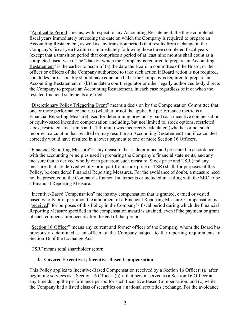 2 “Applicable Period” means, with respect to any Accounting Restatement, the three completed fiscal years immediately preceding the date on which the Company is required to prepare an Accounting Restatement, as well as any transition period (that results from a change in the Company’s fiscal year) within or immediately following those three completed fiscal years (except that a transition period that comprises a period of at least nine months shall count as a completed fiscal year). The “date on which the Company is required to prepare an Accounting Restatement” is the earlier to occur of (a) the date the Board, a committee of the Board, or the officer or officers of the Company authorized to take such action if Board action is not required, concludes, or reasonably should have concluded, that the Company is required to prepare an Accounting Restatement or (b) the date a court, regulator or other legally authorized body directs the Company to prepare an Accounting Restatement, in each case regardless of if or when the restated financial statements are filed. “Discretionary Policy Triggering Event” means a decision by the Compensation Committee that one or more performance metrics (whether or not the applicable performance metric is a Financial Reporting Measure) used for determining previously paid cash incentive compensation or equity-based incentive compensation (including, but not limited to, stock options, restricted stock, restricted stock units and LTIP units) was incorrectly calculated (whether or not such incorrect calculation has resulted or may result in an Accounting Restatement) and if calculated correctly would have resulted in a lower payment to one or more Section 16 Officers. “Financial Reporting Measure” is any measure that is determined and presented in accordance with the accounting principles used in preparing the Company’s financial statements, and any measure that is derived wholly or in part from such measure. Stock price and TSR (and any measures that are derived wholly or in part from stock price or TSR) shall, for purposes of this Policy, be considered Financial Reporting Measures. For the avoidance of doubt, a measure need not be presented in the Company’s financial statements or included in a filing with the SEC to be a Financial Reporting Measure. “Incentive-Based Compensation” means any compensation that is granted, earned or vested based wholly or in part upon the attainment of a Financial Reporting Measure. Compensation is “received” for purposes of this Policy in the Company’s fiscal period during which the Financial Reporting Measure specified in the compensation award is attained, even if the payment or grant of such compensation occurs after the end of that period. “Section 16 Officer” means any current and former officer of the Company whom the Board has previously determined is an officer of the Company subject to the reporting requirements of Section 16 of the Exchange Act. “TSR” means total shareholder return. 3. Covered Executives; Incentive-Based Compensation This Policy applies to Incentive-Based Compensation received by a Section 16 Officer: (a) after beginning services as a Section 16 Officer; (b) if that person served as a Section 16 Officer at any time during the performance period for such Incentive-Based Compensation; and (c) while the Company had a listed class of securities on a national securities exchange. For the avoidance